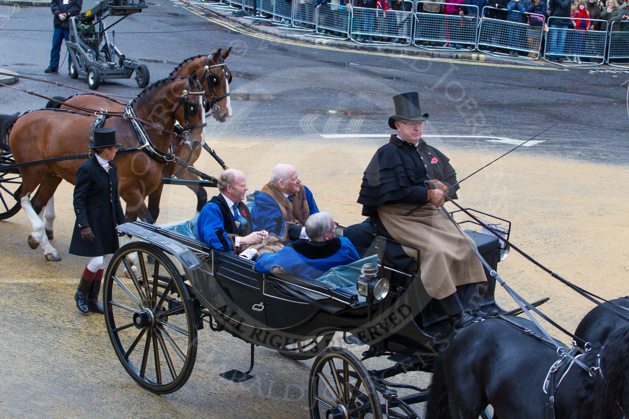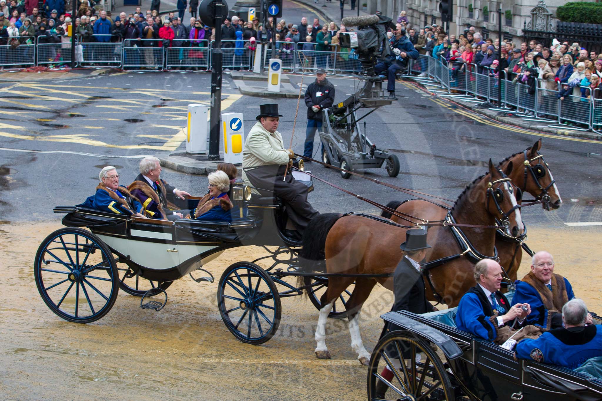 Lord Mayor's Show 2012: Entry 129 - Worshipful Company of Musicians, from left to right: Sir Anthony Cleaver (Senior Warden), Professor John Morehen (Master), Mrs Kathleen Duncan (Junior Warden), and Mrs Margaret Alford (Clerk).. Press stand opposite Mansion House, City of London, London, Greater London, United Kingdom, on 10 November 2012 at 12:04, image #1838