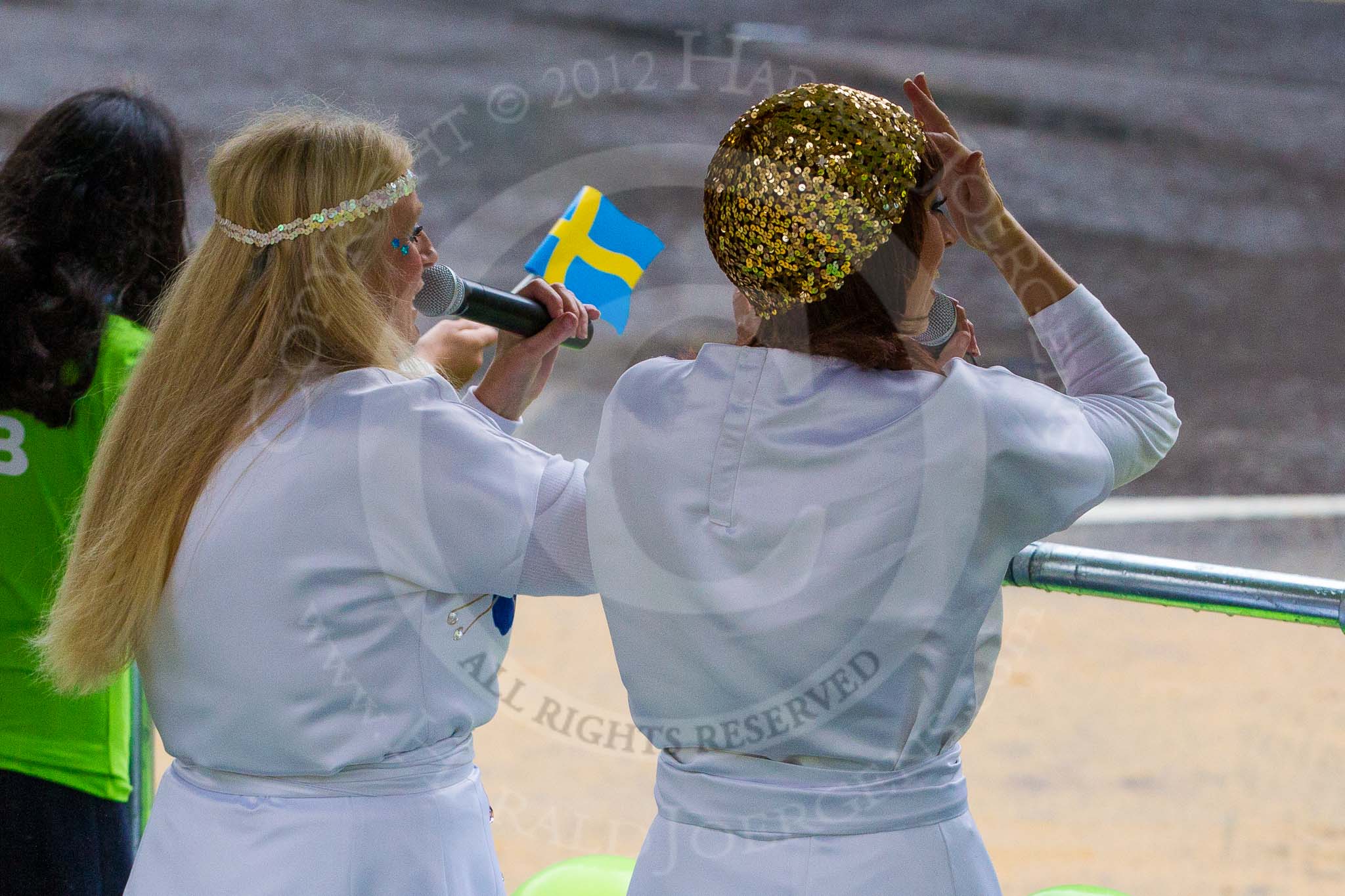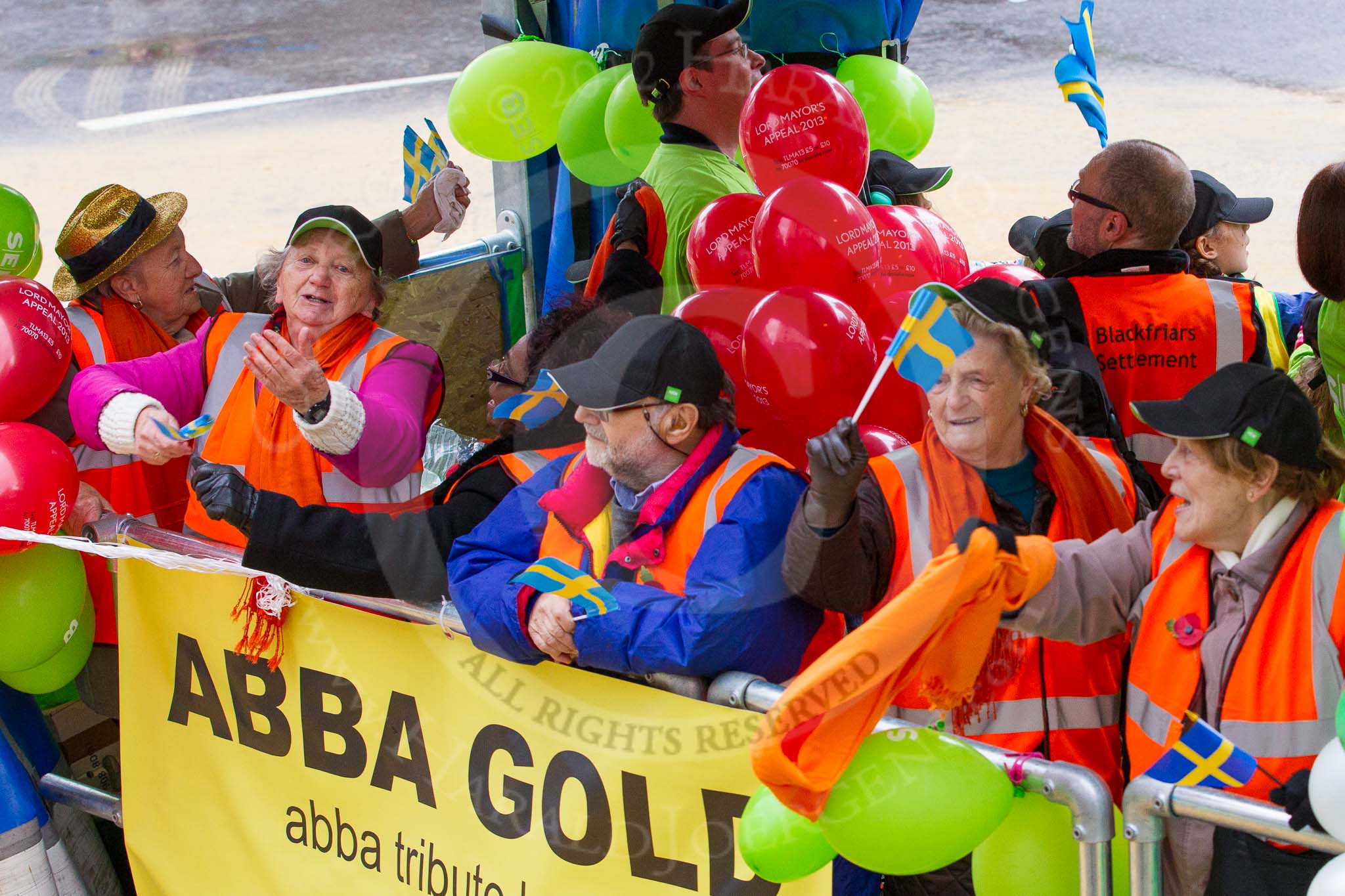 Lord Mayor's Show 2012: Entry 4 - SEB, the Skandinaviska Enskilda Banken, with Blackfriars Settlement and an Abba theme played by "Abba Gold".. Press stand opposite Mansion House, City of London, London, Greater London, United Kingdom, on 10 November 2012 at 11:01, image #203