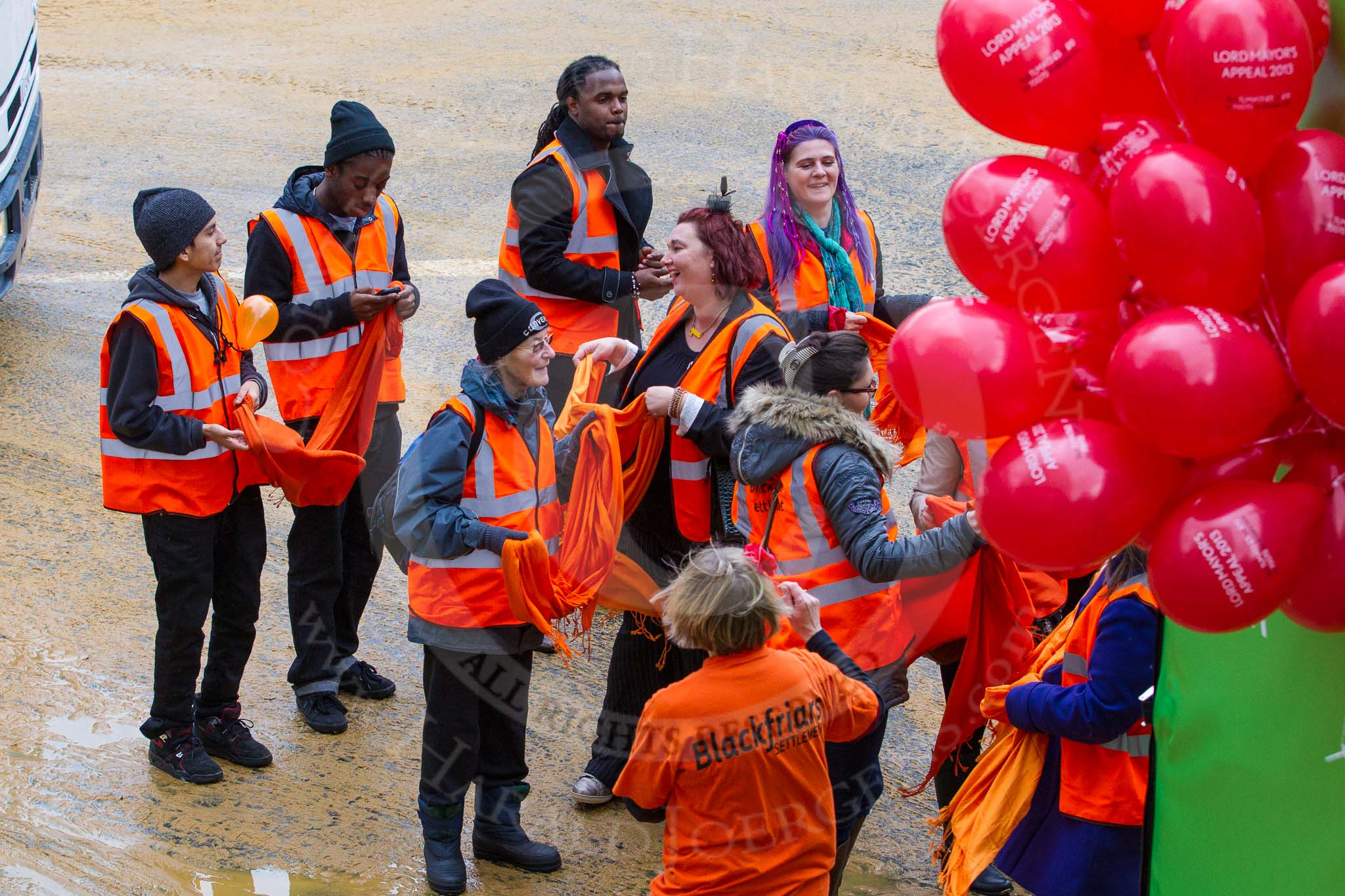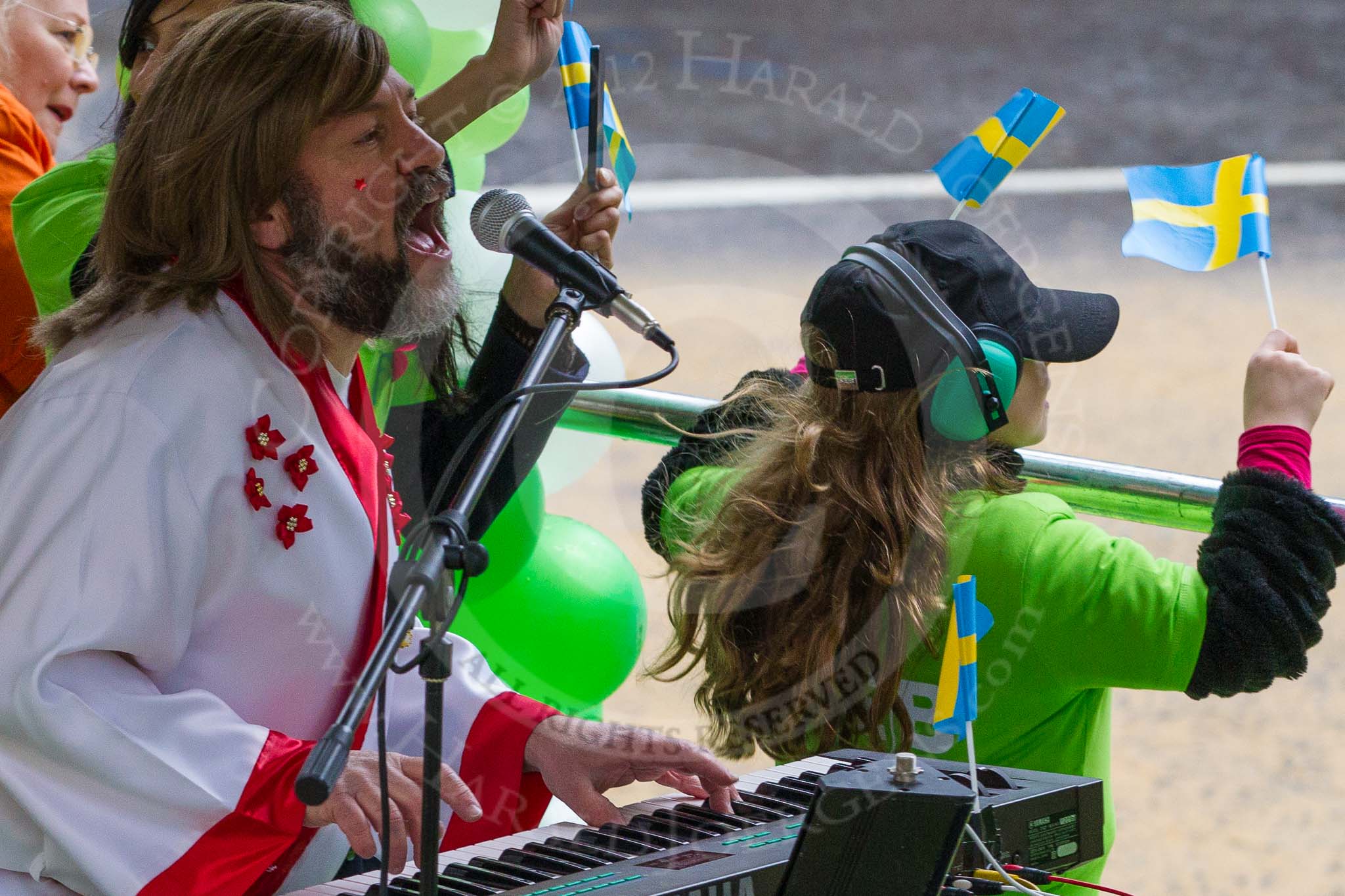 Lord Mayor's Show 2012: Entry 4 - SEB, the Skandinaviska Enskilda Banken, with Blackfriars Settlement and an Abba theme played by "Abba Gold".. Press stand opposite Mansion House, City of London, London, Greater London, United Kingdom, on 10 November 2012 at 11:00, image #197