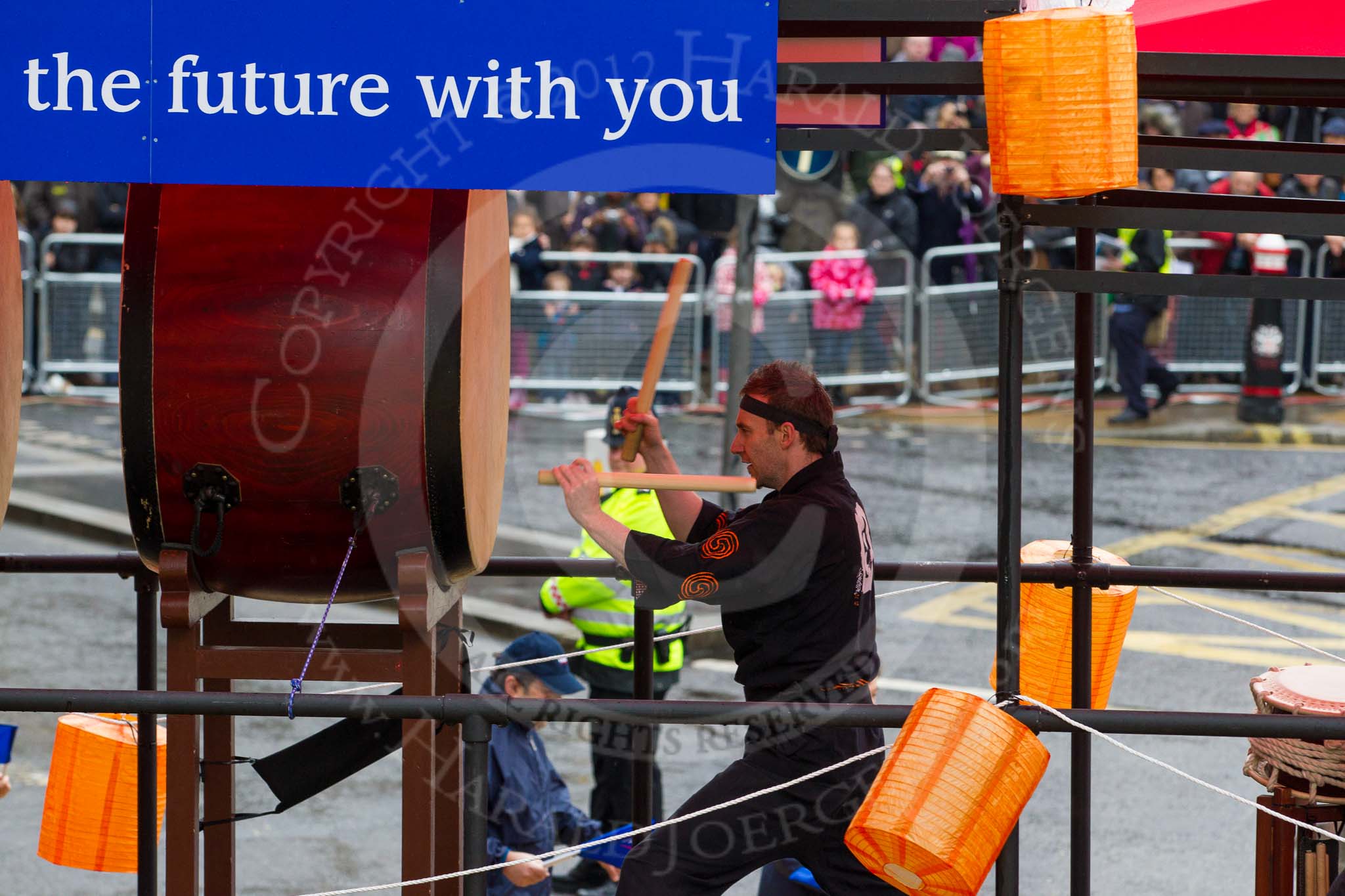 Lord Mayor's Show 2012: Entry 6, Mizuho Corporate Bank, with the drum group Mugenkyo Taiko.. Press stand opposite Mansion House, City of London, London, Greater London, United Kingdom, on 10 November 2012 at 11:02, image #213
