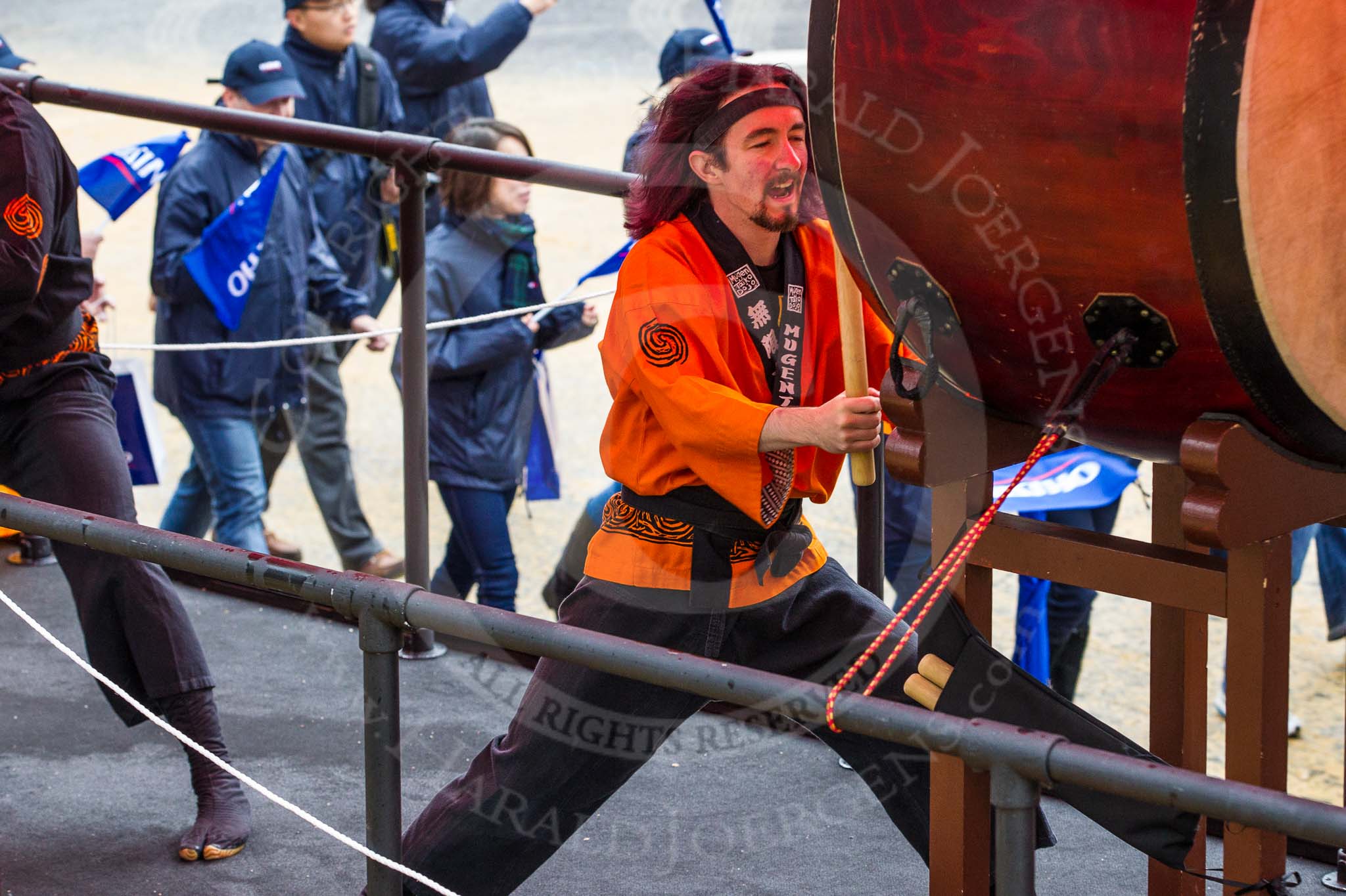 Lord Mayor's Show 2012: Entry 6, Mizuho Corporate Bank, with the drum group Mugenkyo Taiko.. Press stand opposite Mansion House, City of London, London, Greater London, United Kingdom, on 10 November 2012 at 11:02, image #212