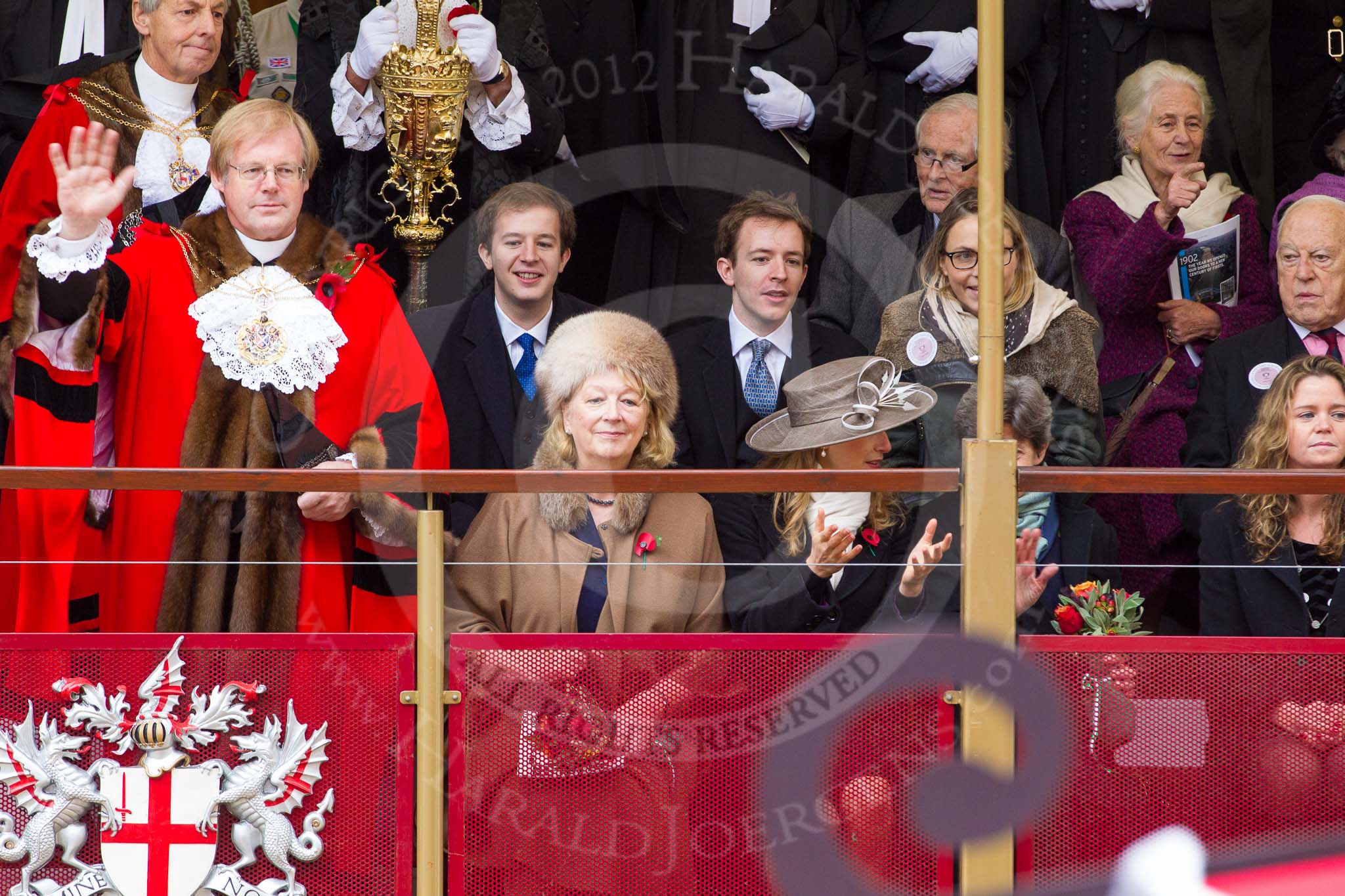 Lord Mayor's Show 2012: The outgoing Lord Mayor, David Wootton, the outgoing Lady Mayoress, Liz Wootton, Sophie Wootton, and James and Christopher Wootton behind.. Press stand opposite Mansion House, City of London, London, Greater London, United Kingdom, on 10 November 2012 at 11:02, image #215