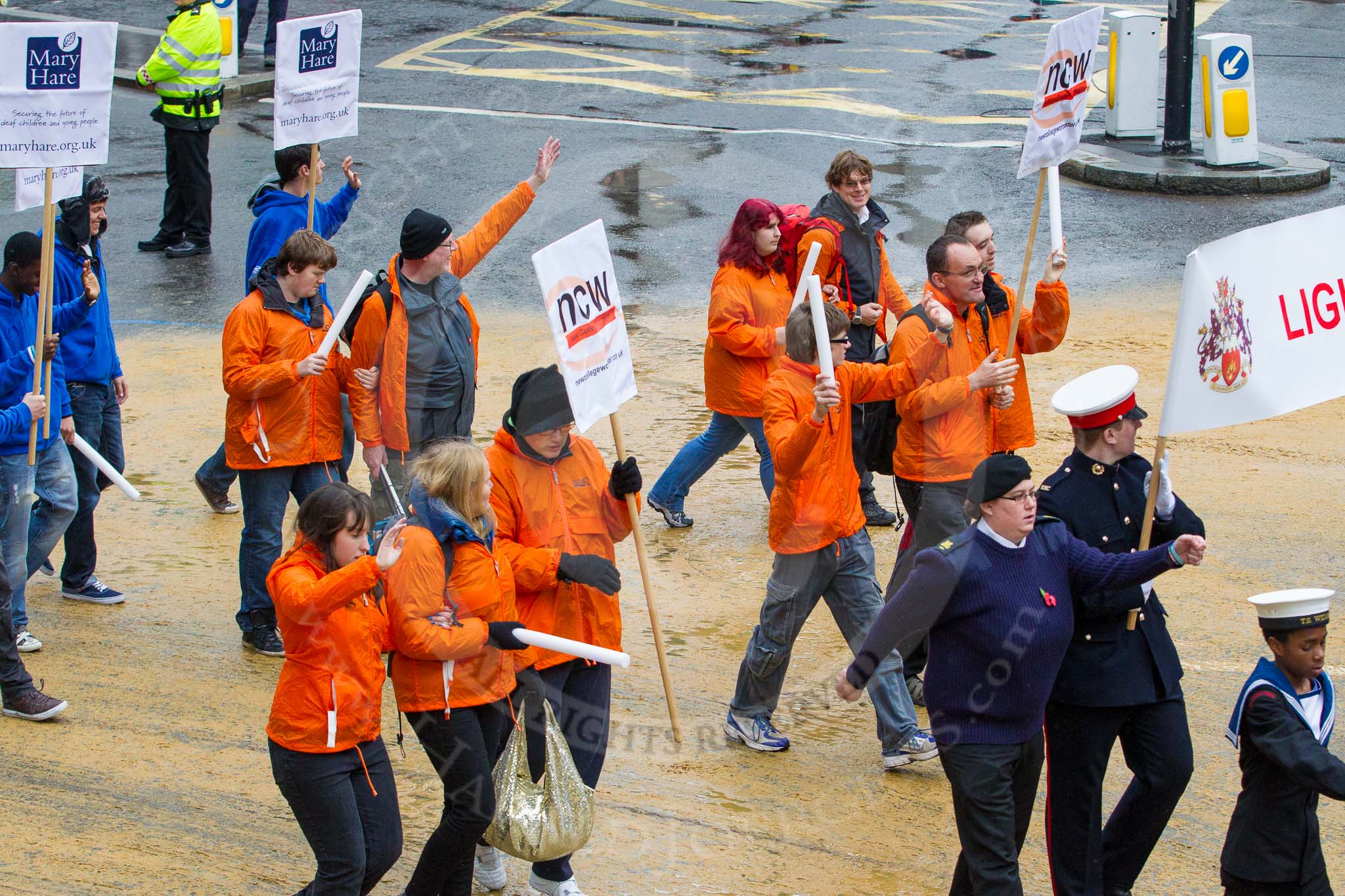 Lord Mayor's Show 2012: Entry 13 - Worshipful Company of Lightmongers, with New College Worcester for the blind and partially sighted, and Mary Hare School for deaf children.. Press stand opposite Mansion House, City of London, London, Greater London, United Kingdom, on 10 November 2012 at 11:05, image #288