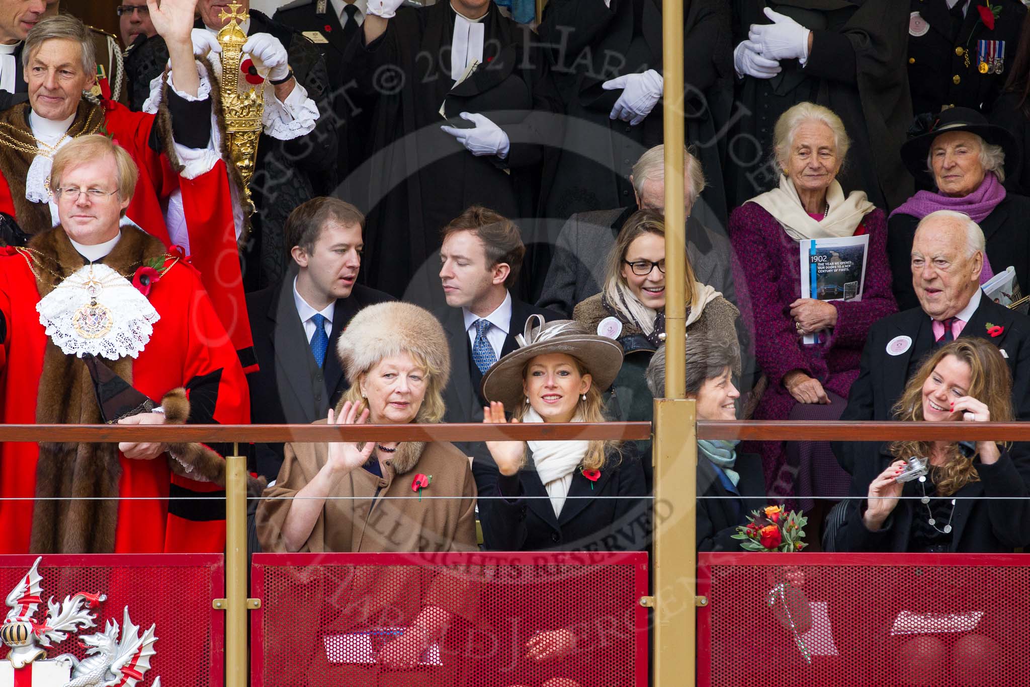 Lord Mayor's Show 2012: The outgoing Lord Mayor, David Wootton, the outgoing Lady Mayoress, Liz Wootton, Sophie Wootton, and James and Christopher Wootton behind.. Press stand opposite Mansion House, City of London, London, Greater London, United Kingdom, on 10 November 2012 at 11:06, image #295