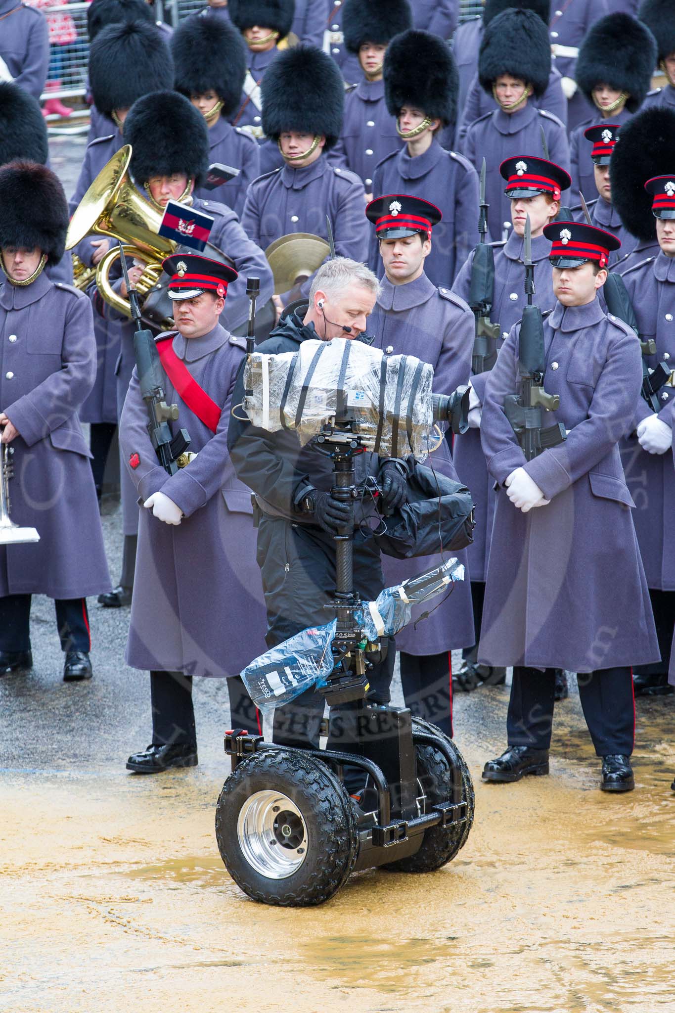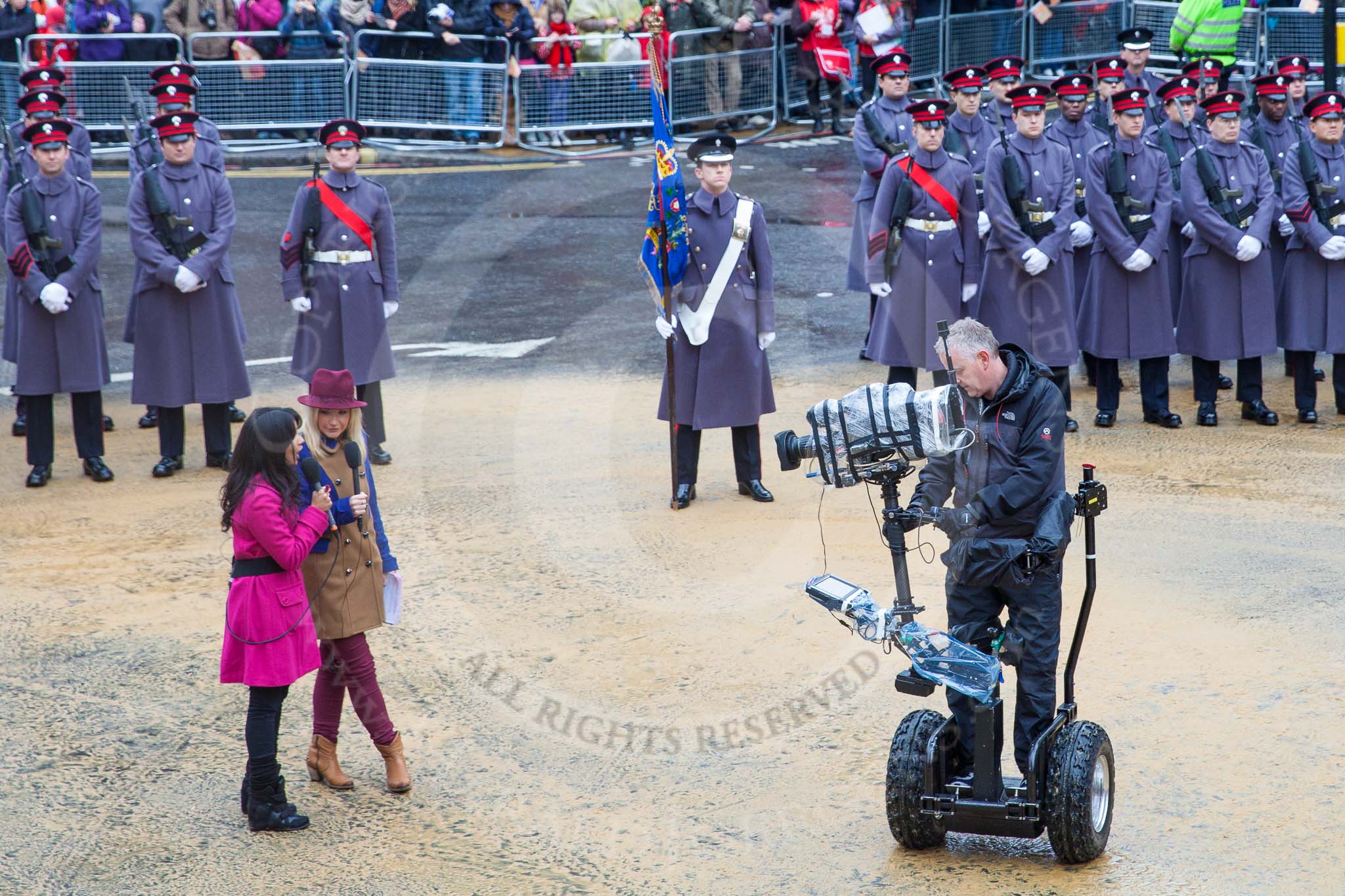 Lord Mayor's Show 2012: The Honourable Artillery Company (HAC) providing the Guard of Honour at the 2012 Lord Mayor's Show, here with the BBC/SIS cameraman and his Segway-mounted camera.. Press stand opposite Mansion House, City of London, London, Greater London, United Kingdom, on 10 November 2012 at 10:42, image #103