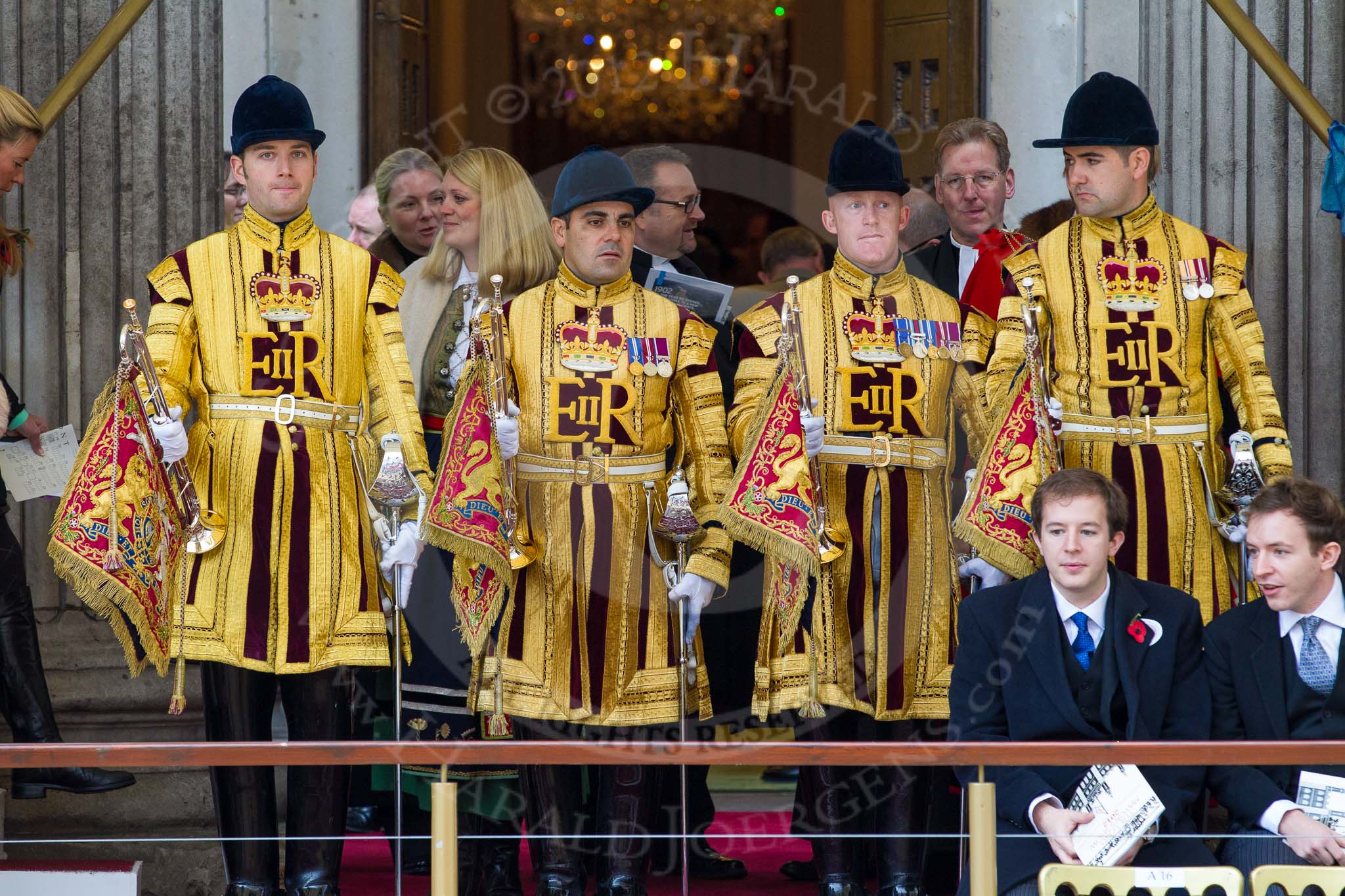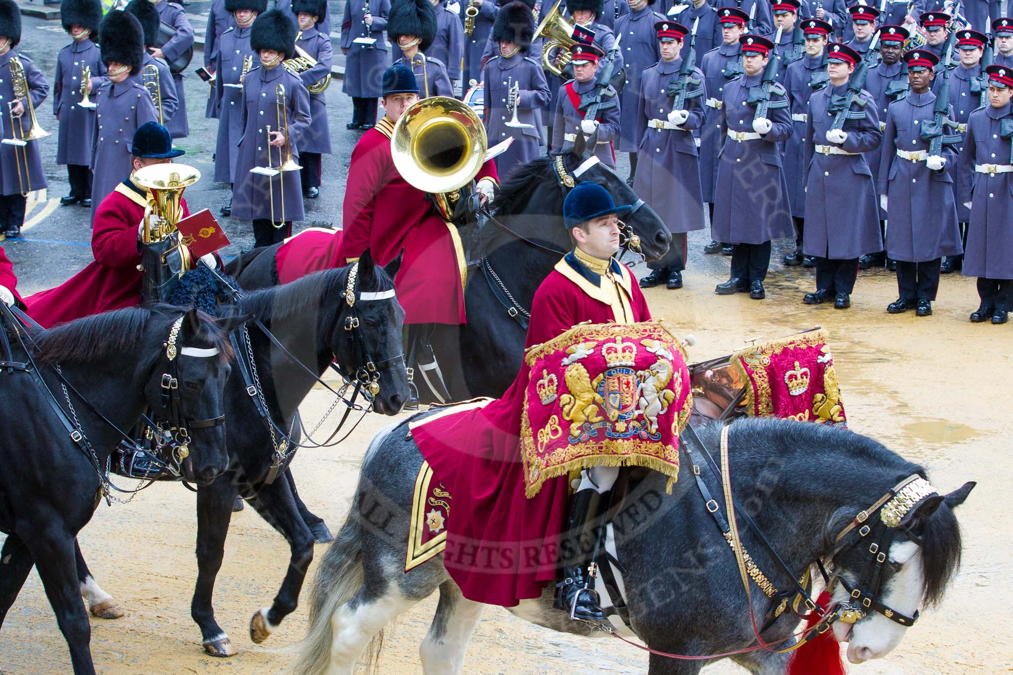 Lord Mayor's Show 2012: Household Cavalry trumpeters in their state uniforms, about to announce the arrival of the Lord Mayor.. Press stand opposite Mansion House, City of London, London, Greater London, United Kingdom, on 10 November 2012 at 10:45, image #110