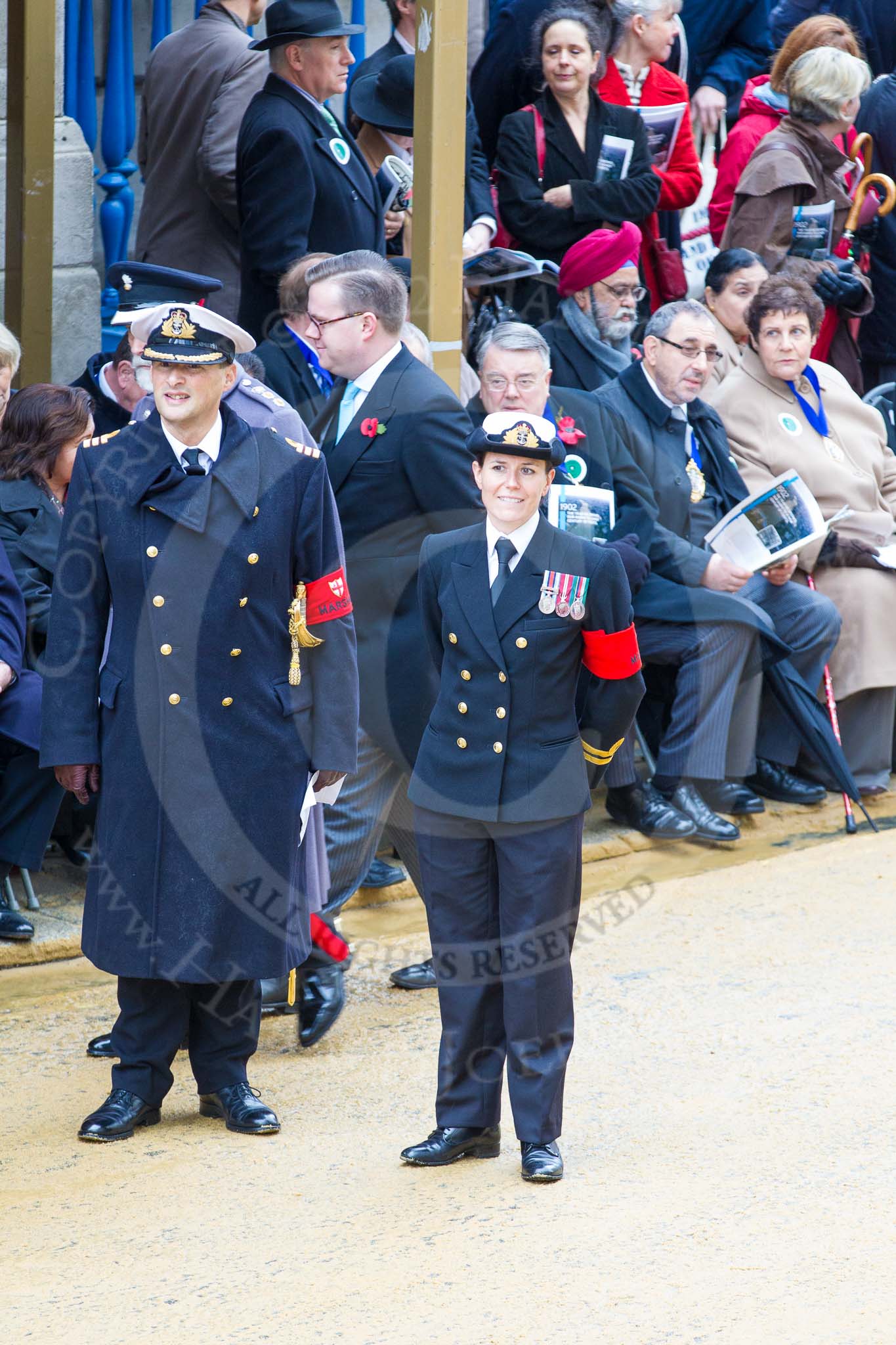 Lord Mayor's Show 2012: A Royal Navy Commander and a Lieutenant acting as Marshalls at the event.. Press stand opposite Mansion House, City of London, London, Greater London, United Kingdom, on 10 November 2012 at 10:45, image #111