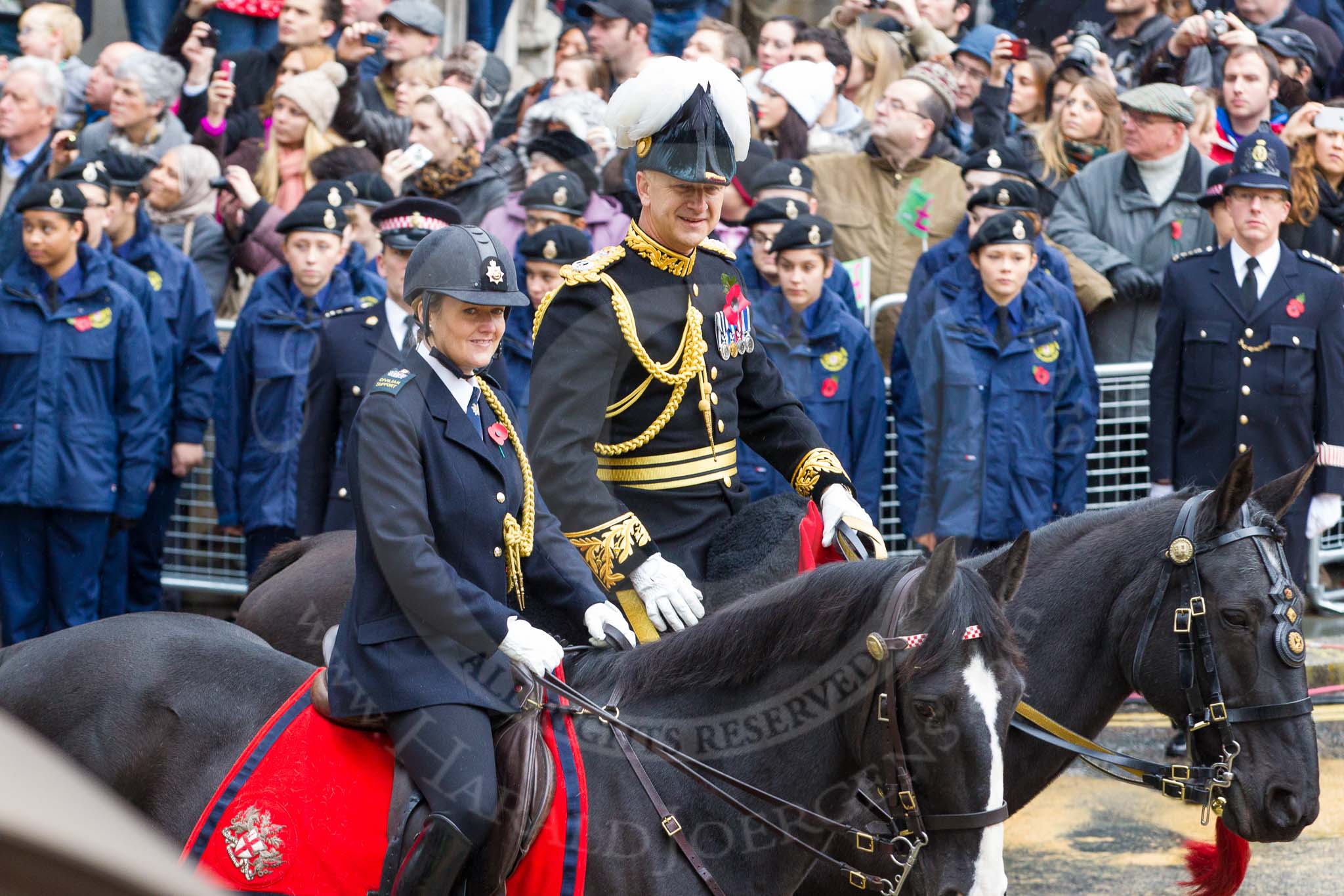 Lord Mayor's Show 2012: Rebecca Jenkins, senior Police Staff Trainer within the City of London Police mounted branch, and Adrian Leppard, Commissioner of the City of London Police.. Press stand opposite Mansion House, City of London, London, Greater London, United Kingdom, on 10 November 2012 at 10:48, image #115