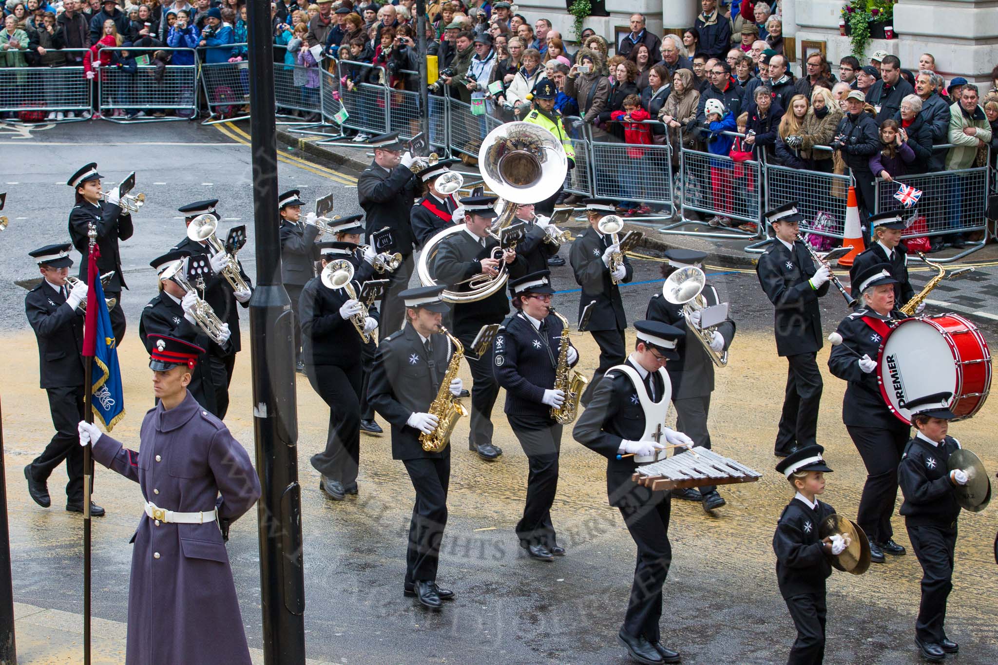 Lord Mayor's Show 2012: Entry 92 - St John Ambulance Talbot Corps of Drums.. Press stand opposite Mansion House, City of London, London, Greater London, United Kingdom, on 10 November 2012 at 11:41, image #1228