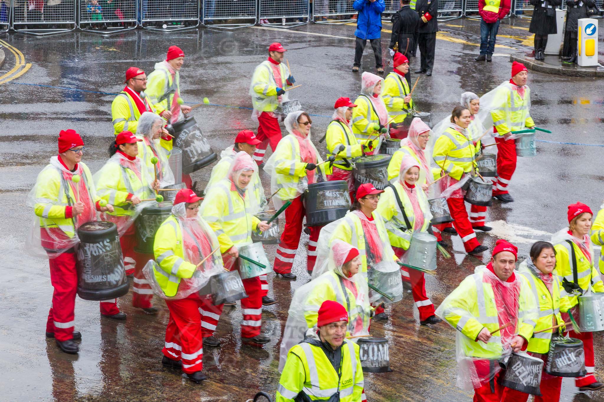 Lord Mayor's Show 2013: 59-Recycling in the City- The Binbot is joined again by his drumming street sweepers to celebrate 20th anniversary of the City's unique Clean City Awards scheme..