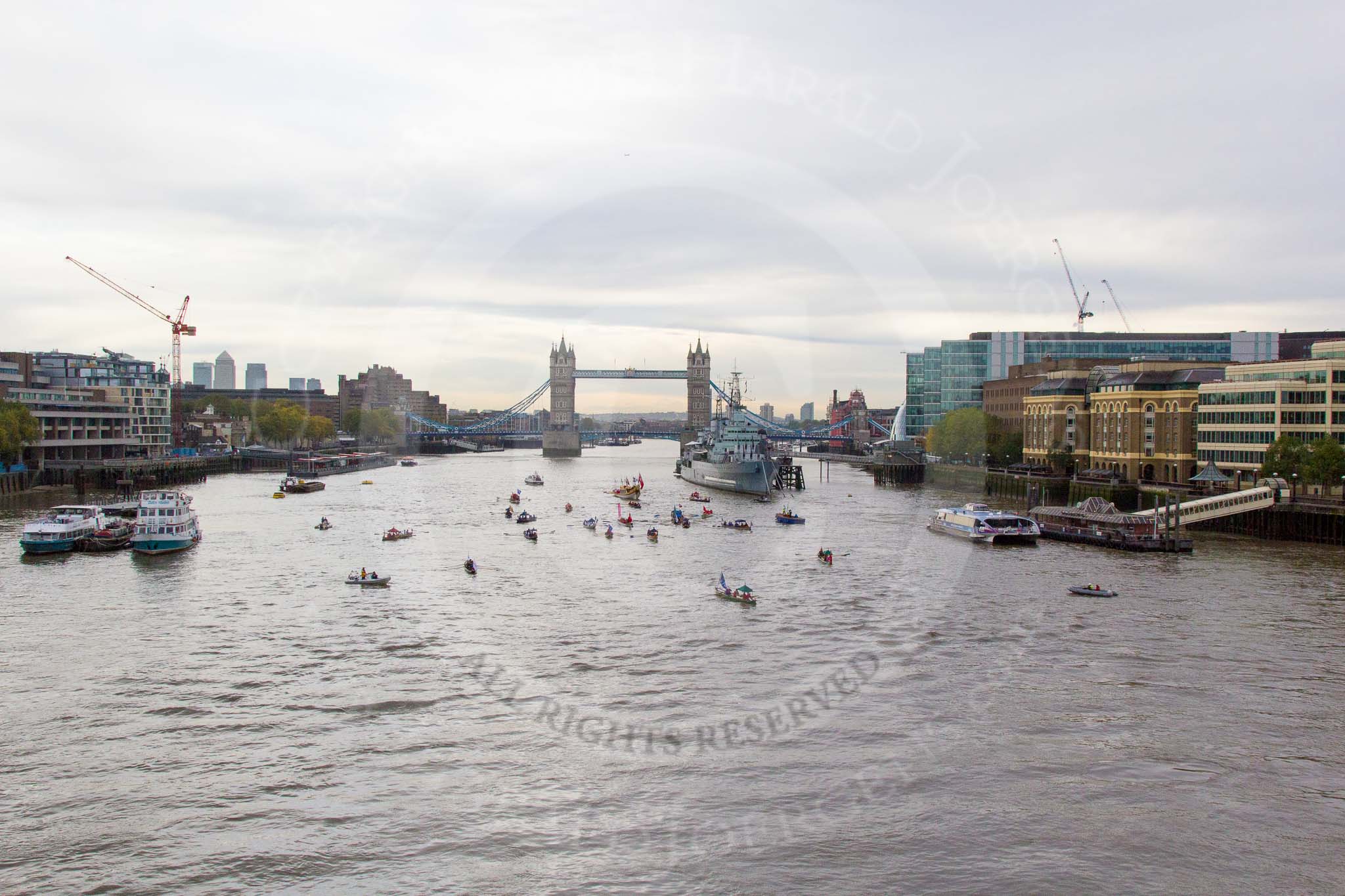 Lord Mayor's Show 2013: The Lord Mayor's flotilla approaching Tower Bridge. Photo: Mike Garland..