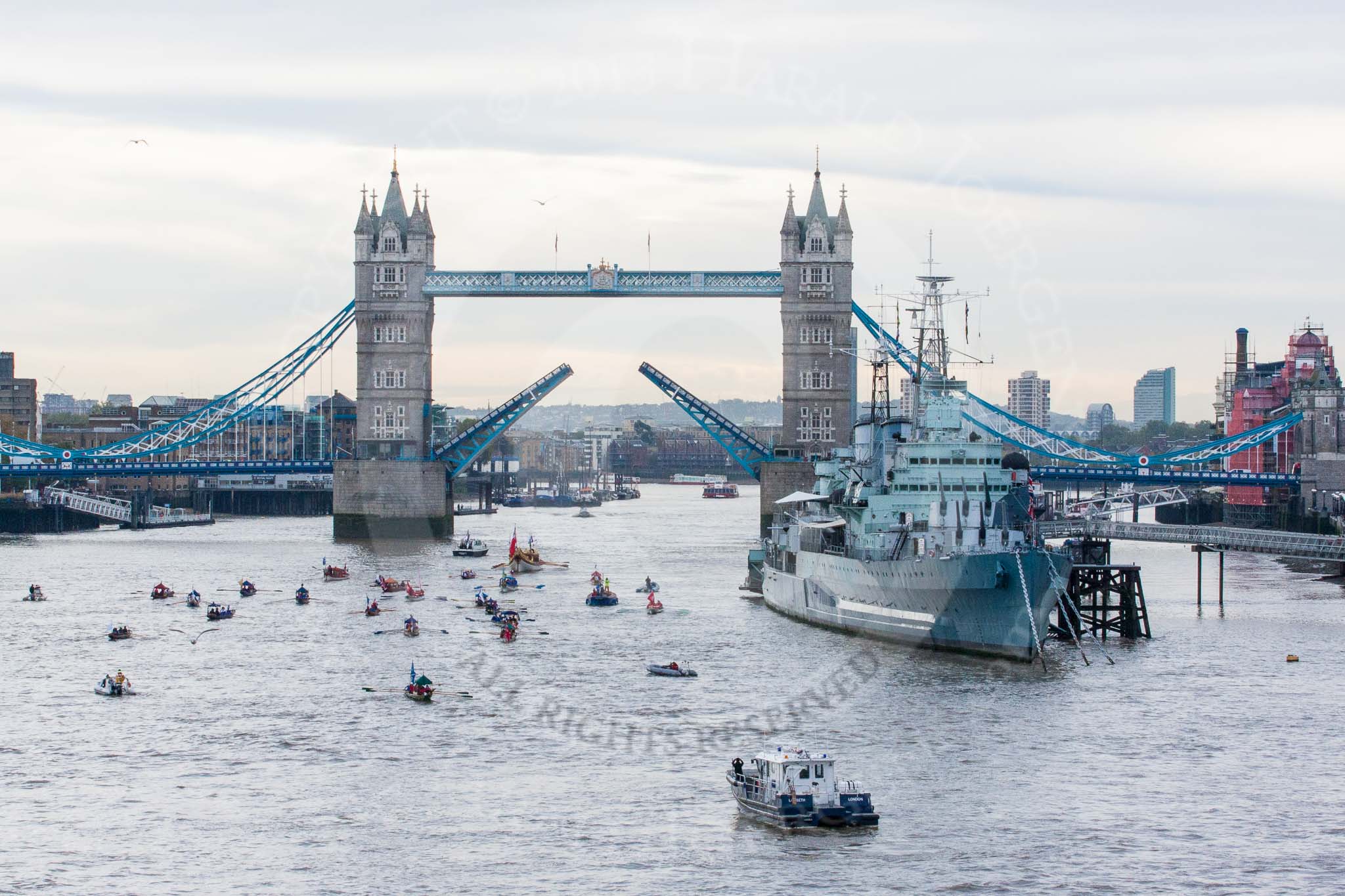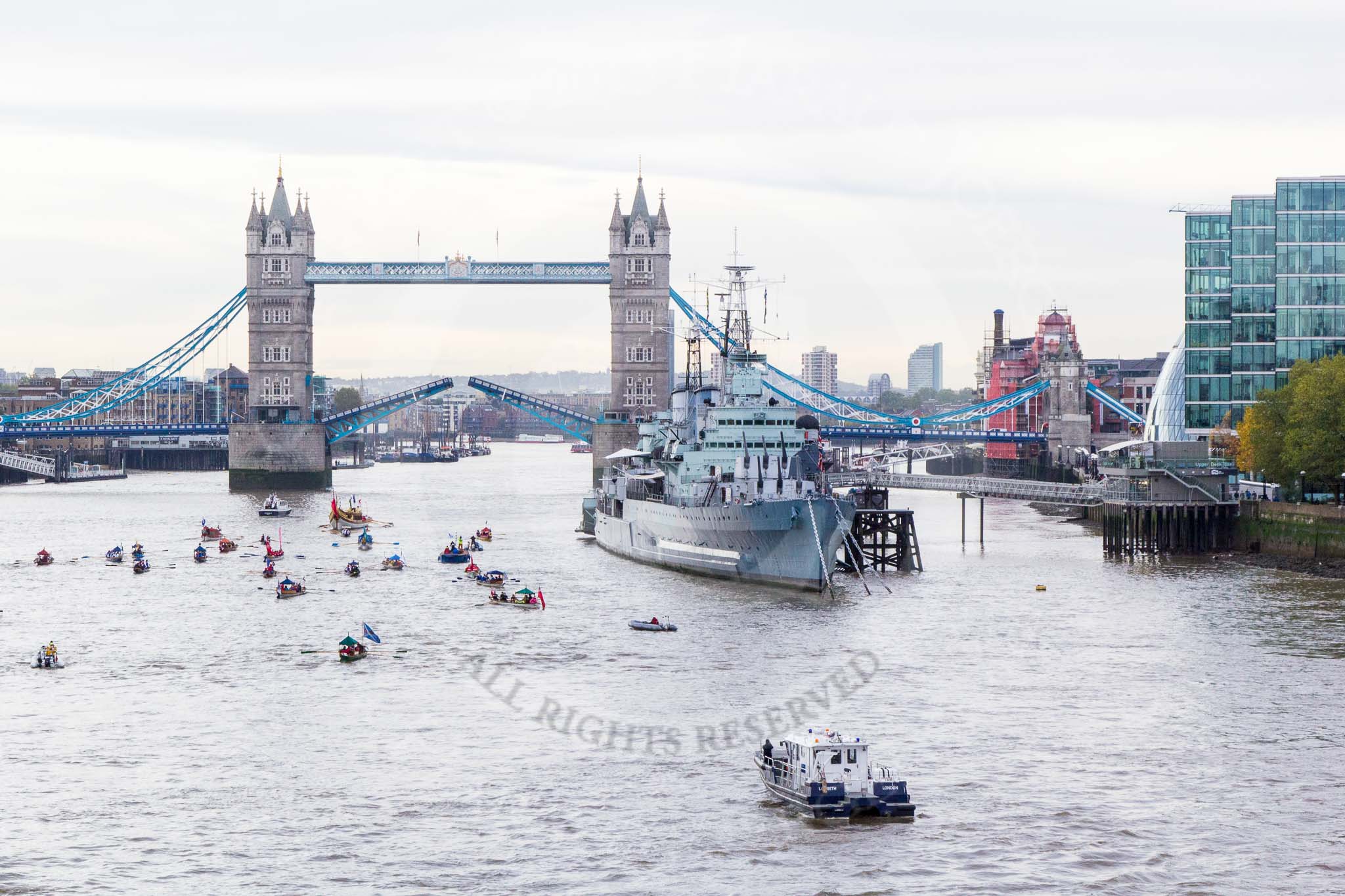 Lord Mayor's Show 2013: The Lord Mayor's flotilla approaching Tower Bridge, the bridge being raised in honour of the Lord Mayor, who's also Admiral of the Port of London. On the right HMS Belfast. Photo: Mike Garland..