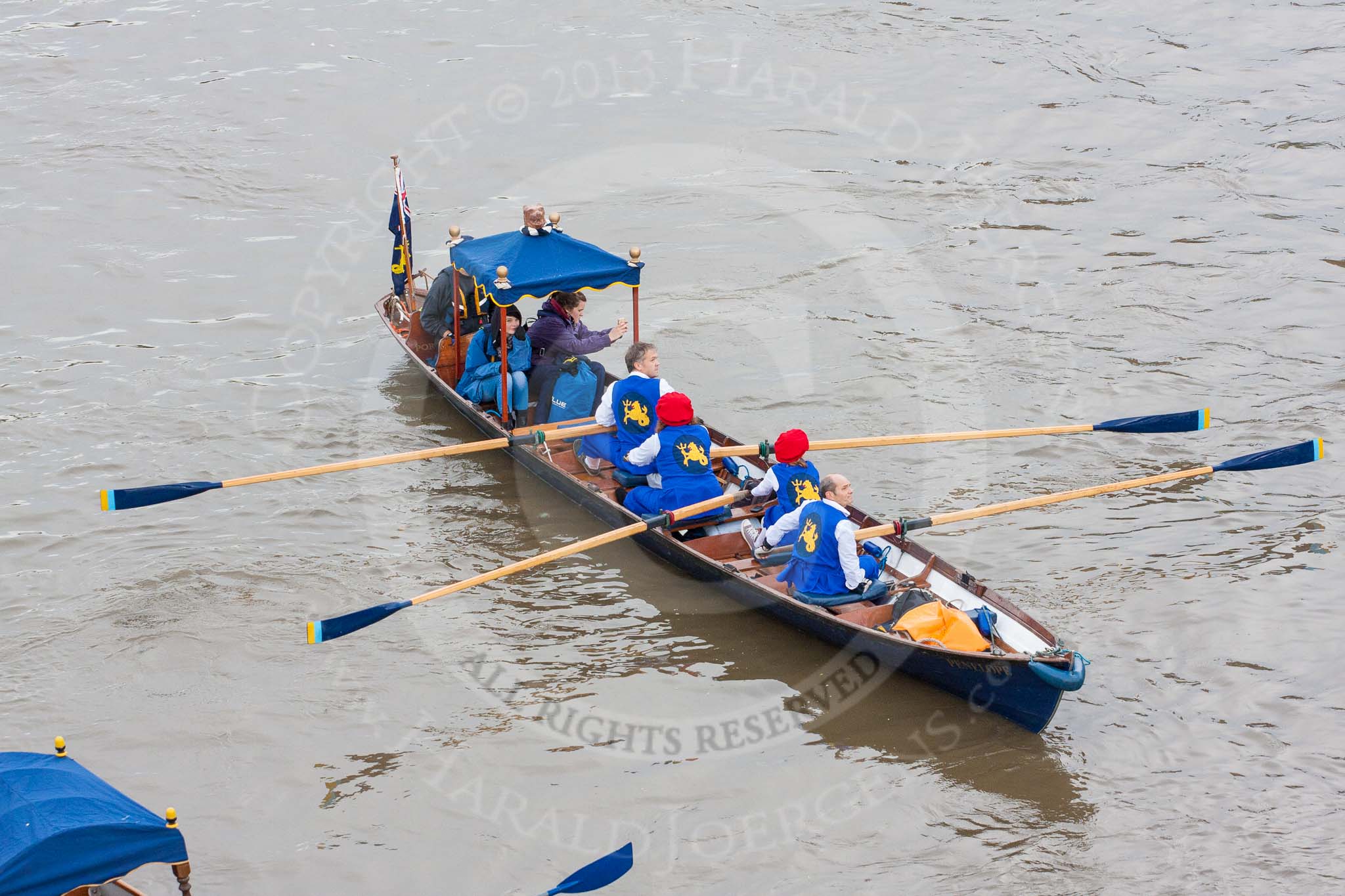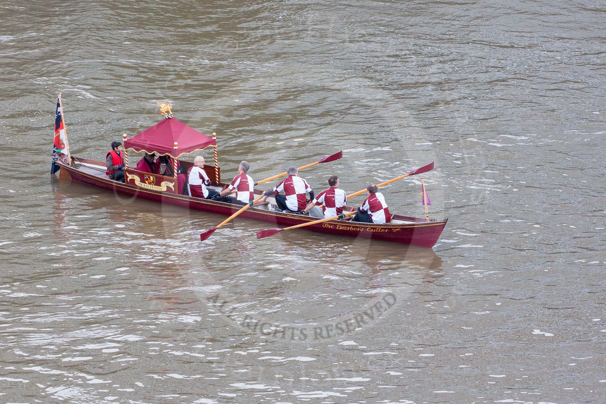 Lord Mayor's Show 2013: The Lord Mayor's flotilla, here cutter 'The Barbers Cutter', crewed by the Barbers Company. Photo be Mike Garland..