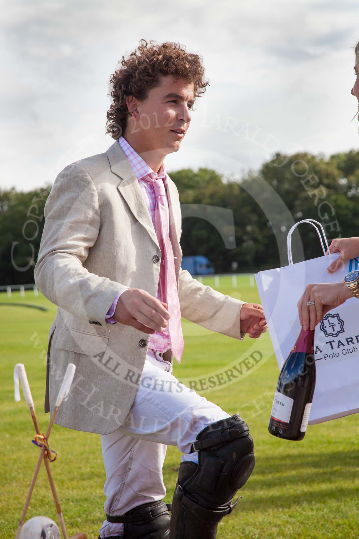 7th Heritage Polo Cup finals: Emerging Switzerland Justo Saveedra receiving La Tarde Polo Club Prizes with Clare Cotton of 'Cotton & Gems'.. Hurtwood Park Polo Club, Ewhurst Green, Surrey, United Kingdom, on 05 August 2012 at 17:06, image #274