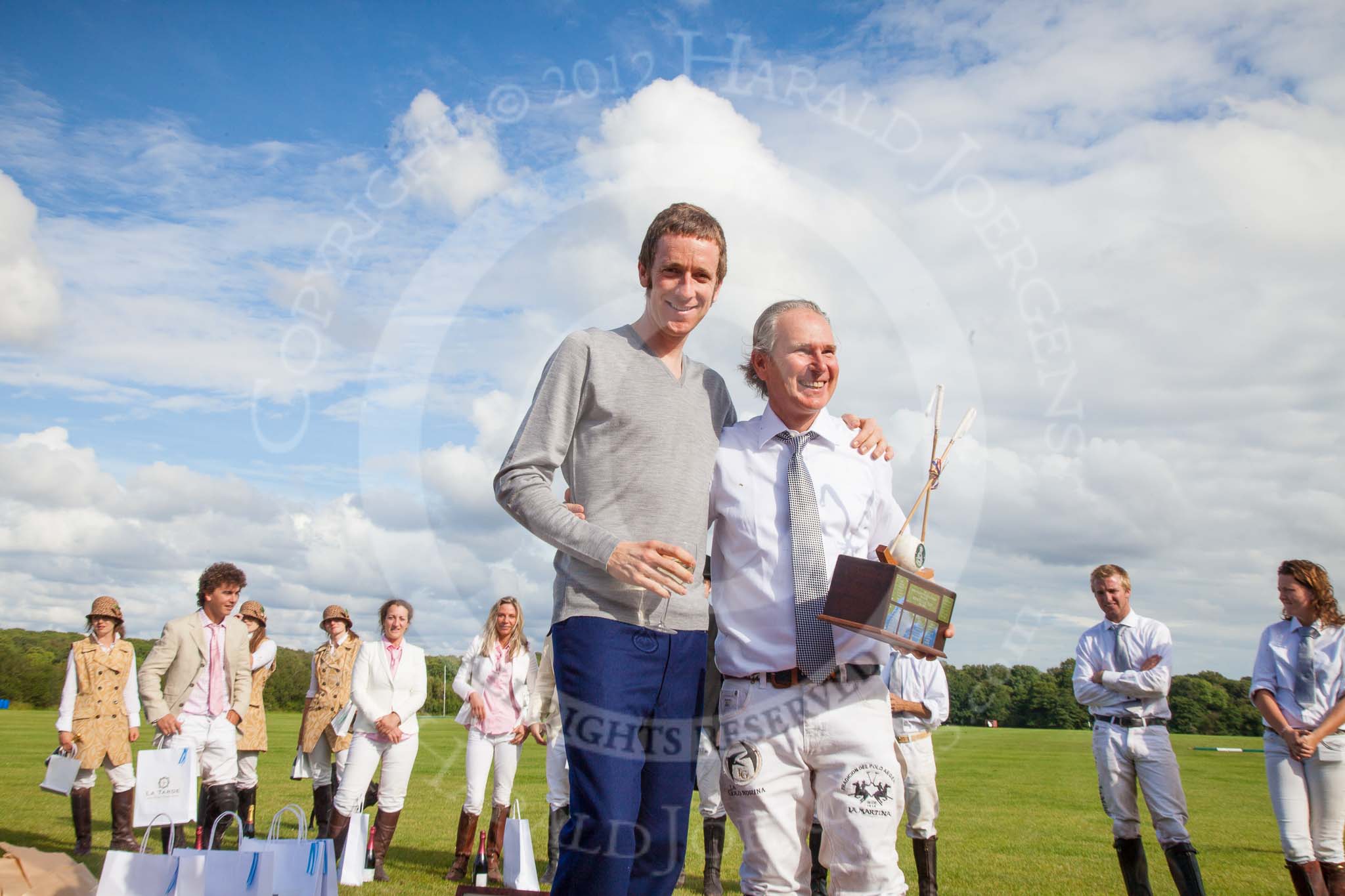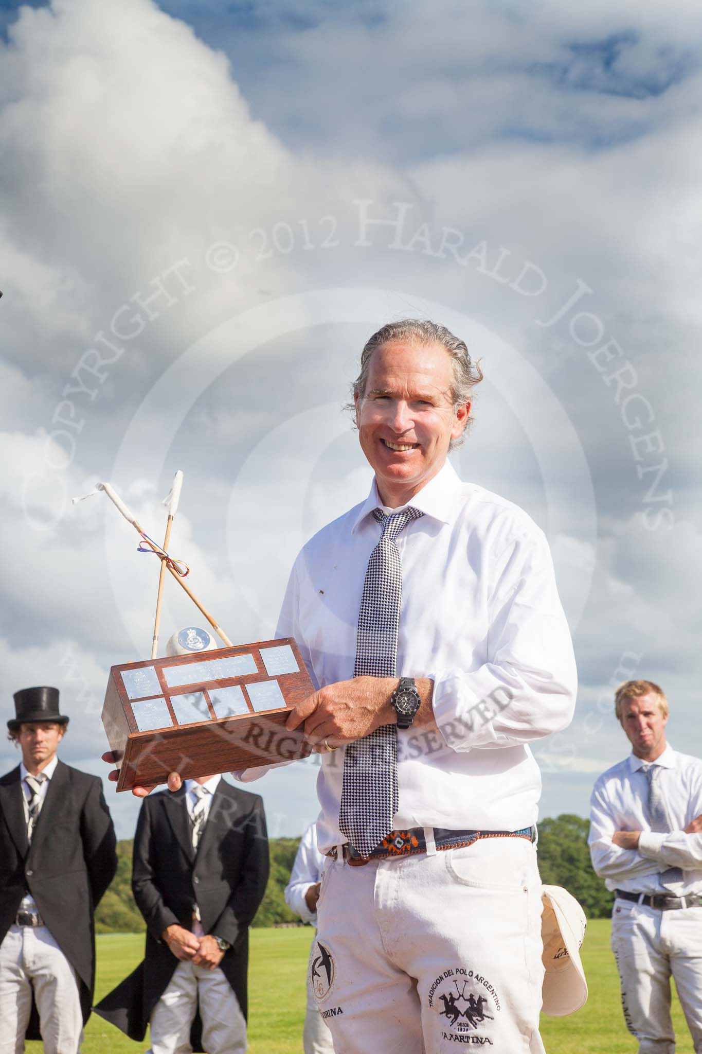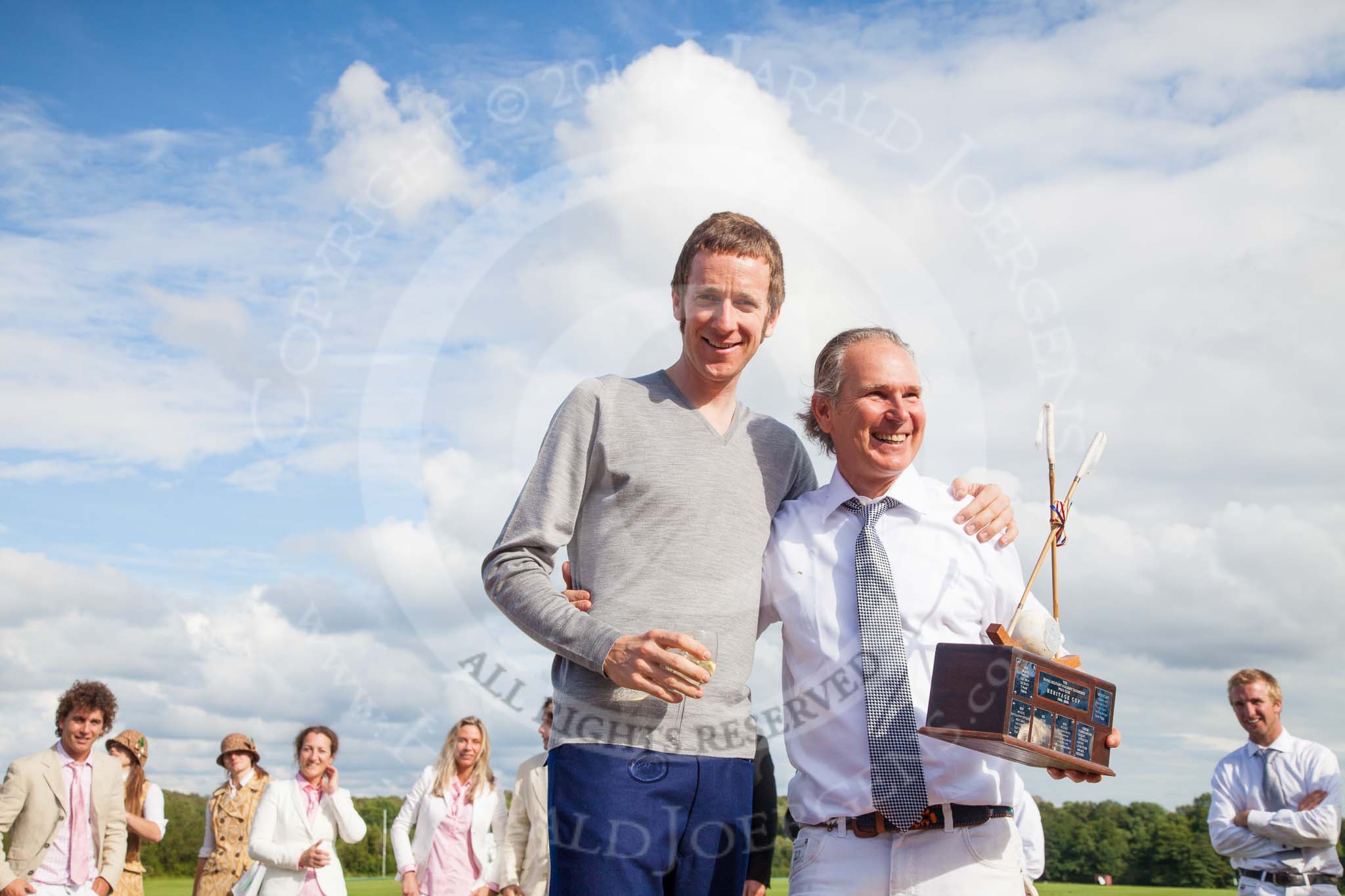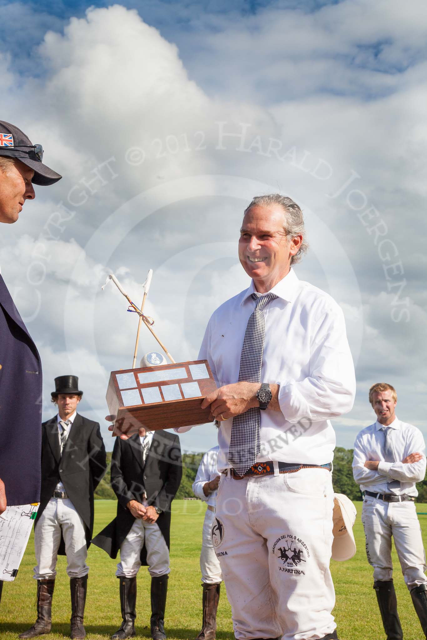 7th Heritage Polo Cup finals: Bradley Wiggins with La Golondrina Argentina Polo Patron Paul Oberschneider presenting the HERITAGE POLO CUP 2012.. Hurtwood Park Polo Club, Ewhurst Green, Surrey, United Kingdom, on 05 August 2012 at 17:07, image #285