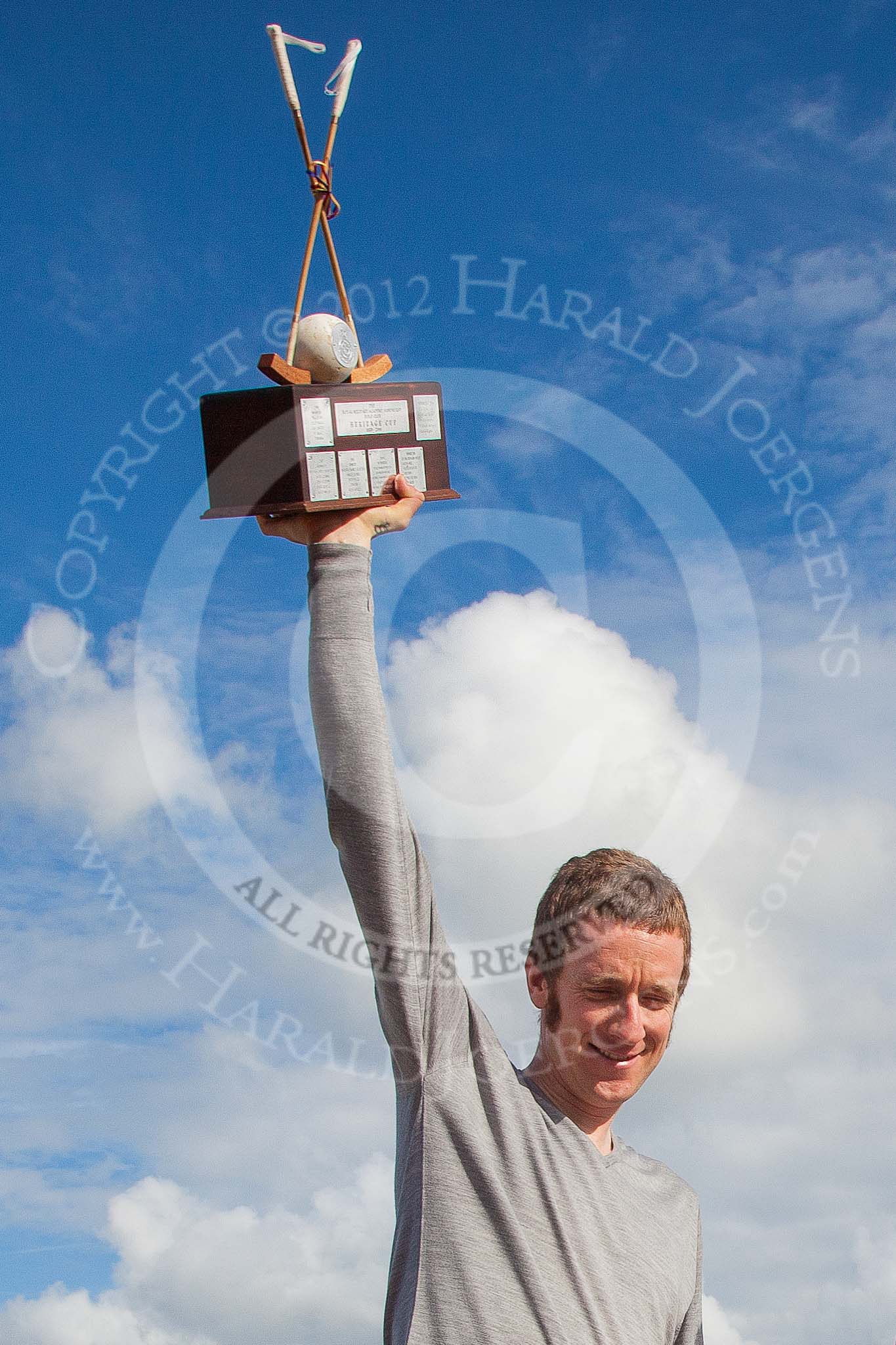 7th Heritage Polo Cup finals: Bradley Wiggins Winner of Tour de France and Olympic Medalist London 2012 'swops wheels for polo' holding up high the HERITAGE POLO CUP Trophy 2012.. Hurtwood Park Polo Club, Ewhurst Green, Surrey, United Kingdom, on 05 August 2012 at 17:07, image #280