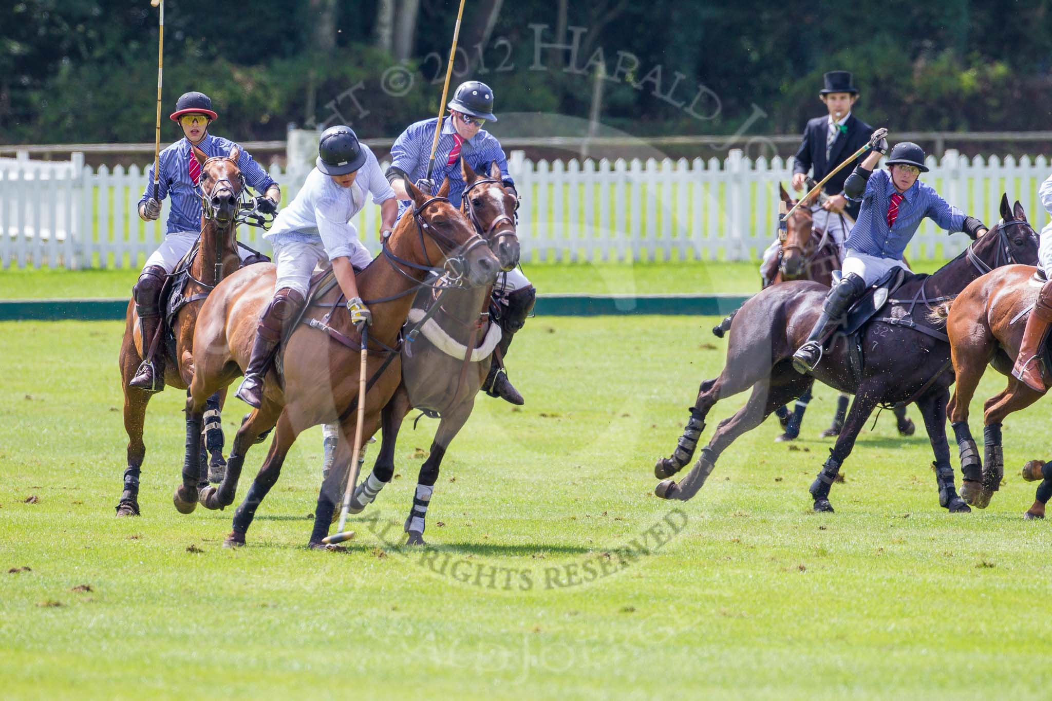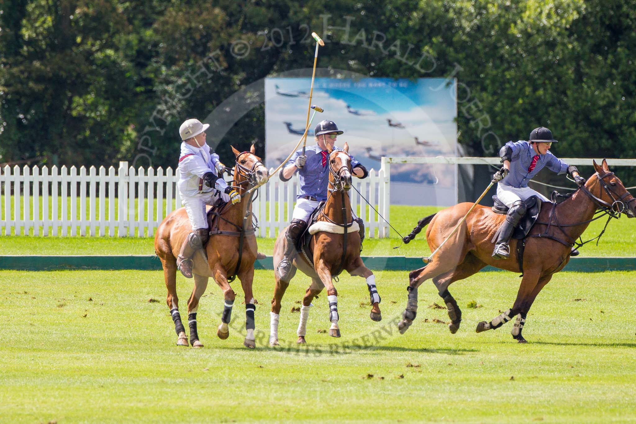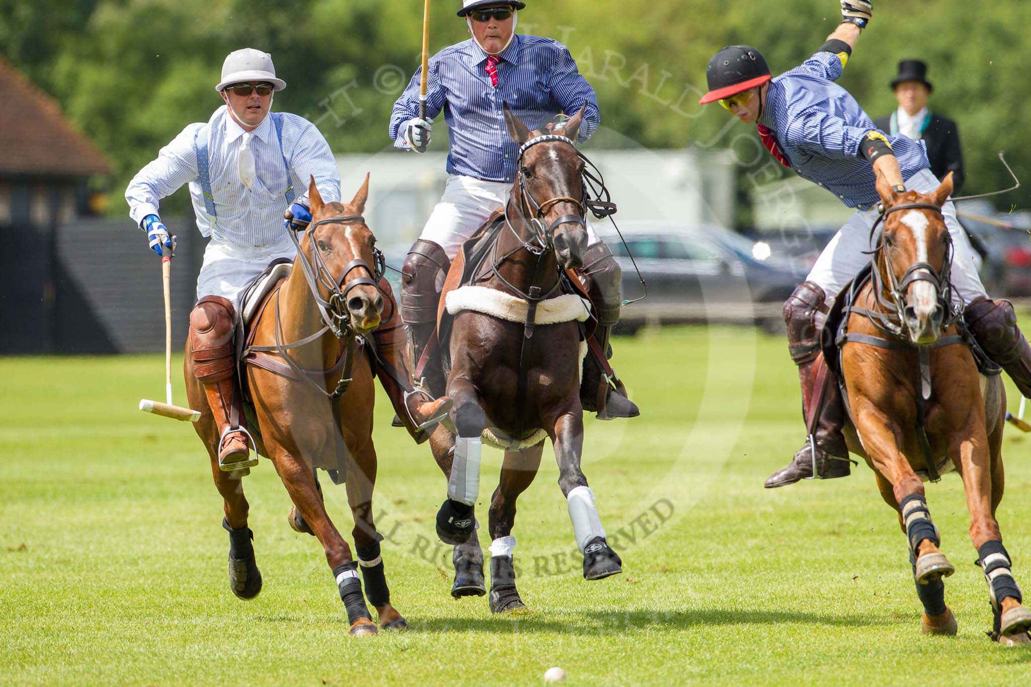 7th Heritage Polo Cup finals: Alex Vent of La Mariposa Argentina on the line of the ball - checked out by Henry Fisher and James Rome & John Martin on his toes..