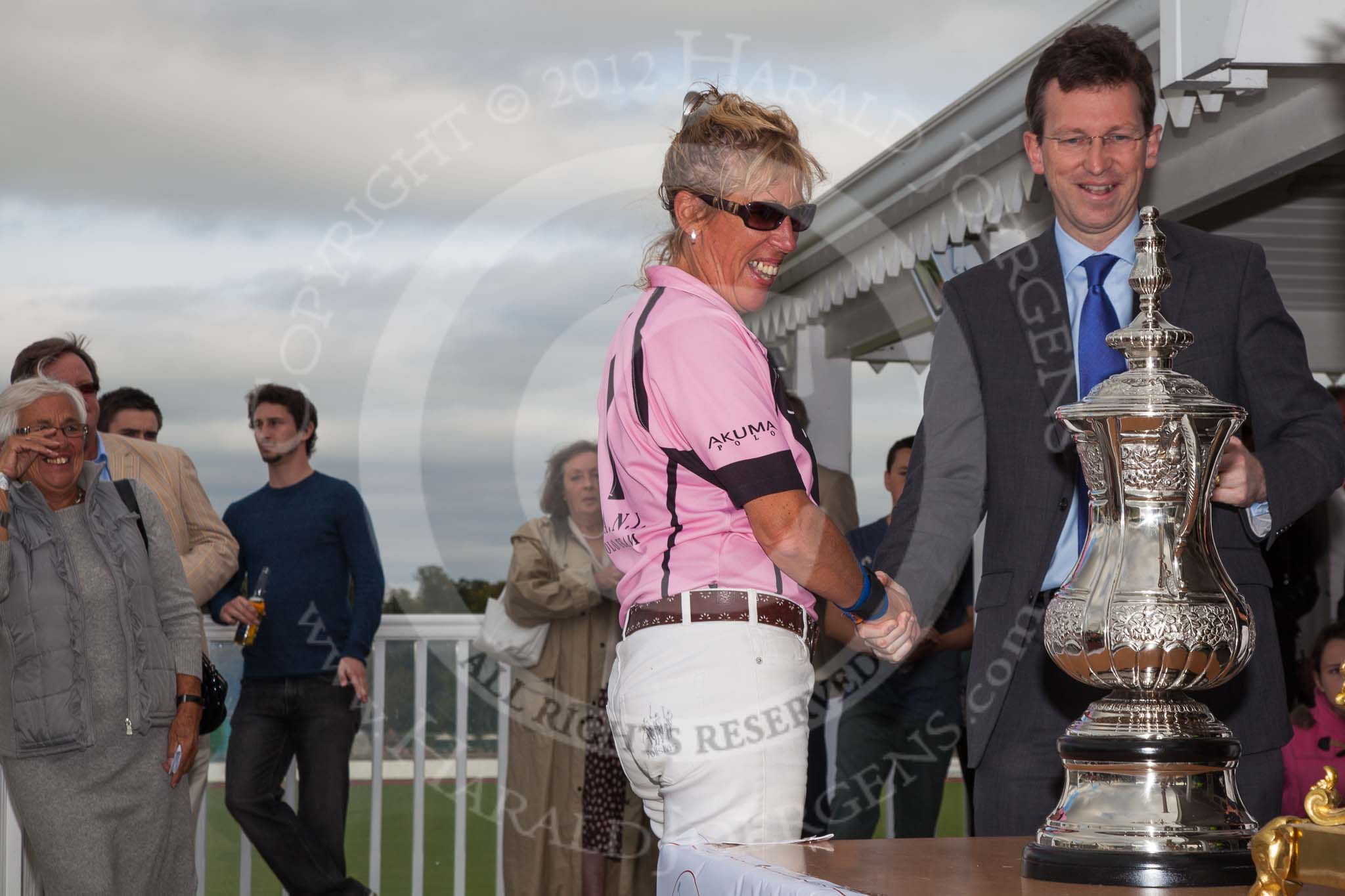 DBPC Polo in the Park 2012: Lousie Jebson and Sebastian Funes of the C.A.N.I. team, the winner of the 4 Goal Tusk Trophy Tournament. On the right Southam and Kenilworth MP Jeremy Clark.. Dallas Burston Polo Club, Stoneythorpe Estate, Southam, Warwickshire, United Kingdom, on 16 September 2012 at 16:40, image #251