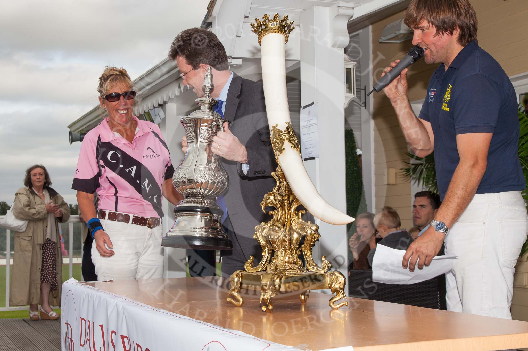 DBPC Polo in the Park 2012: Southam and Kenilworth MP Jeremy Clark at the price-giving, with the winner of the 4 Goal Tusk Trophy Tournament, C.A.N.I., here Lousie Jebson. On the microphon Karl-Ude Martinez.. Dallas Burston Polo Club, Stoneythorpe Estate, Southam, Warwickshire, United Kingdom, on 16 September 2012 at 16:40, image #249
