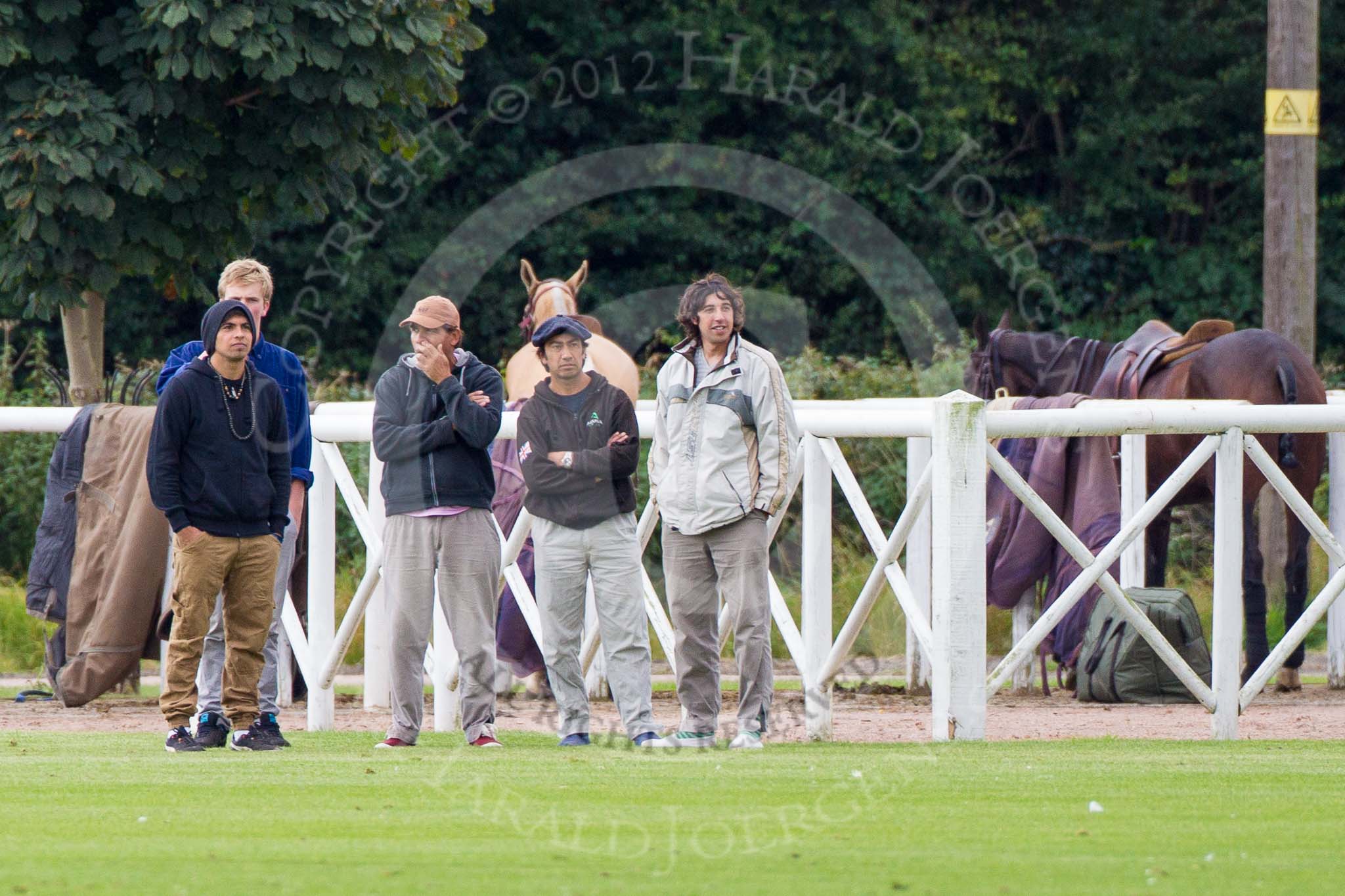 DBPC Polo in the Park 2012: Grooms watching the match JCS v Rated People.. Dallas Burston Polo Club, Stoneythorpe Estate, Southam, Warwickshire, United Kingdom, on 16 September 2012 at 11:01, image #65