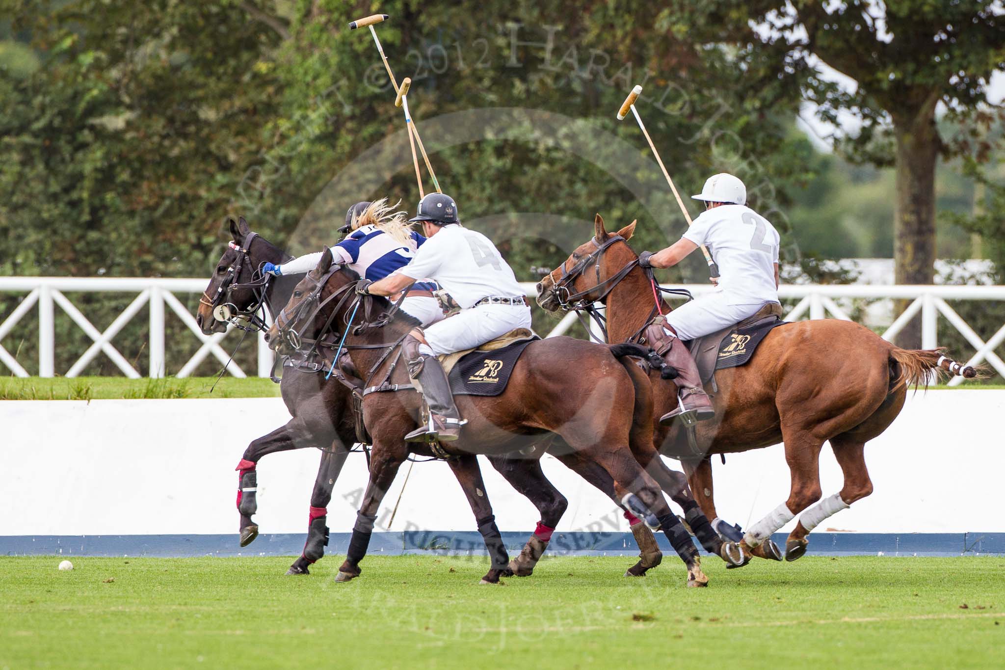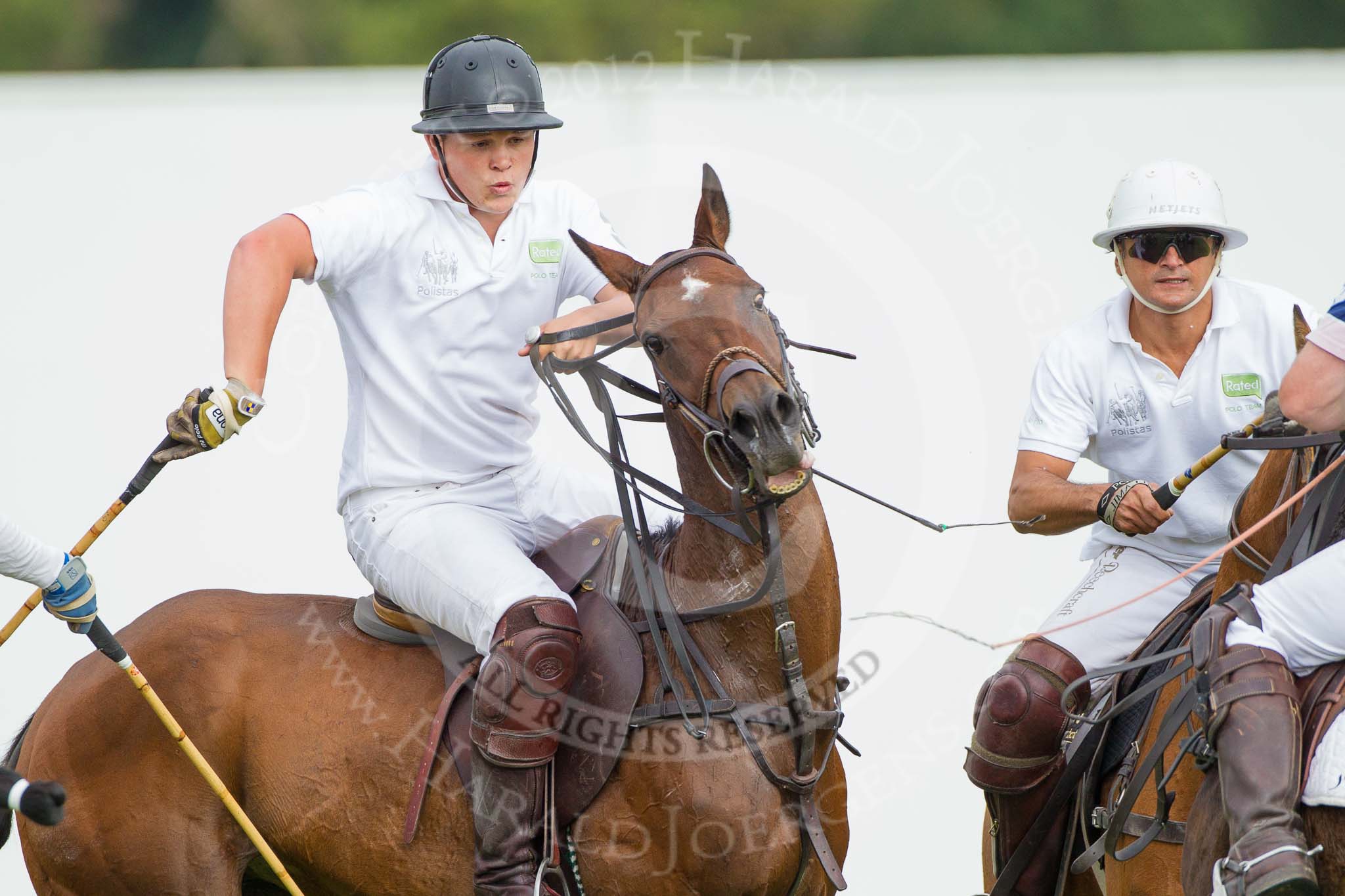 DBPC Polo in the Park 2012: Rated People Polo Team #4, Johnny Moreland-Lynn, and #2, Tariq Dag Khan, v JCS #3, Emma Nicolson.. Dallas Burston Polo Club, Stoneythorpe Estate, Southam, Warwickshire, United Kingdom, on 16 September 2012 at 11:13, image #72