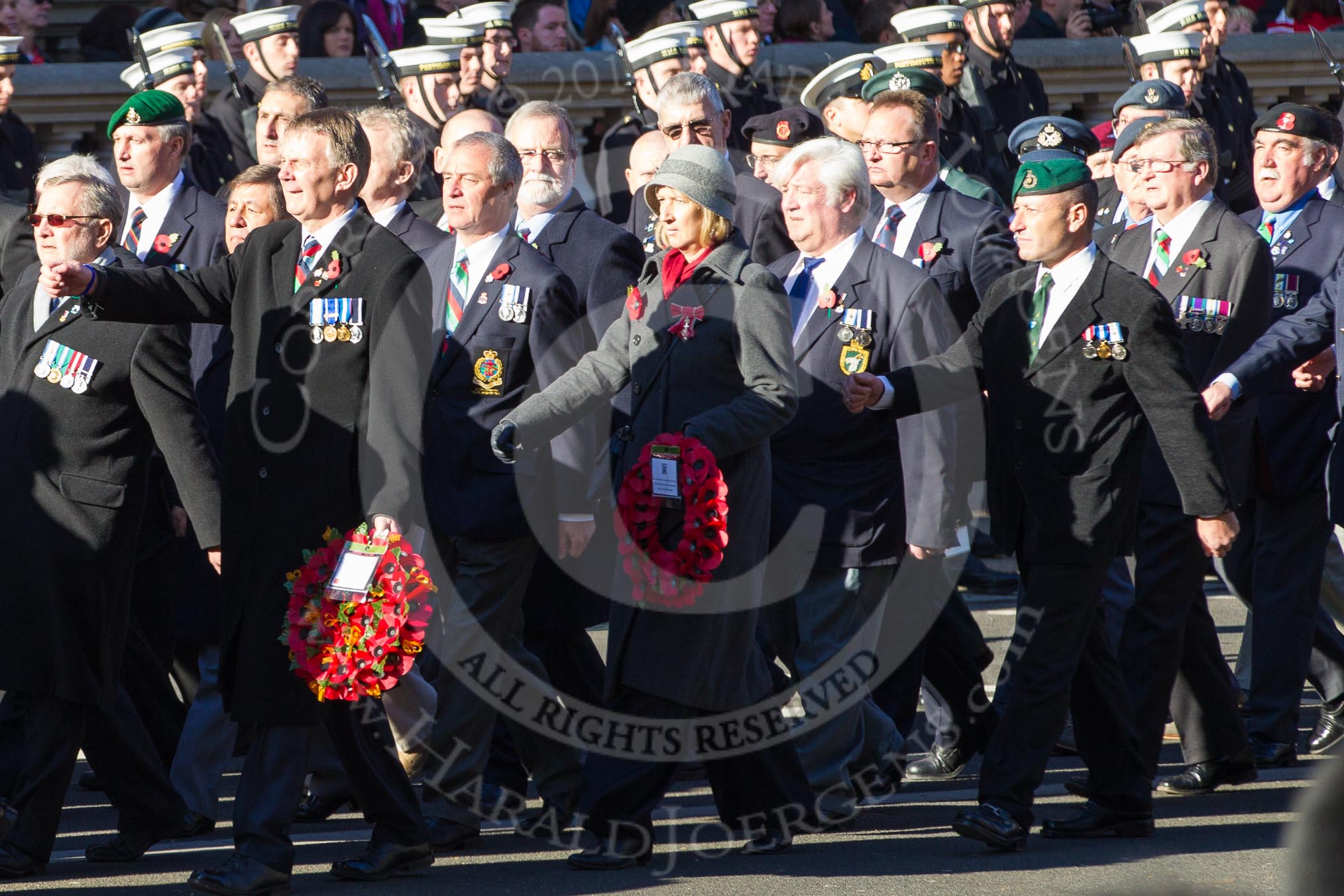 Remembrance Sunday 2012 Cenotaph March Past: Group D1 - South Atlantic Medal Association (www.sama82.org.uk), veterans of the Falklands war in 1982 and islanders from that time. The lady with the wreath and the grey hat is Sukey Cameron, the United Kingdom - Falkland Islands Government Representative. Three rows behind her, in the green and glue uniform, two Norwegian officers, Kevan Watton and Jake Husker..