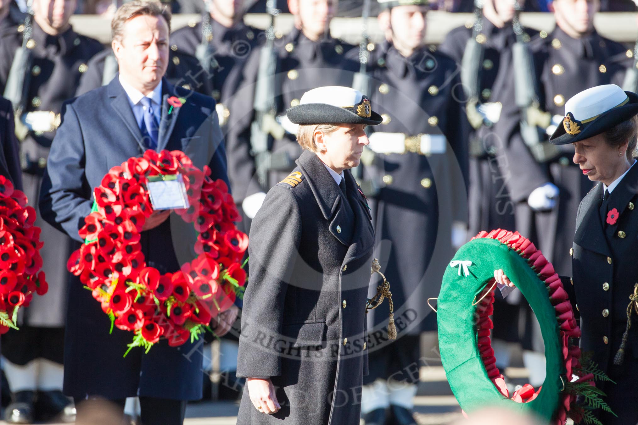 Commander Anne Sullivan, Royal Navy, handing, as Equerry, the wreath to HRH The Princess Royal. In the background the Prime Minister, David Cameron.
