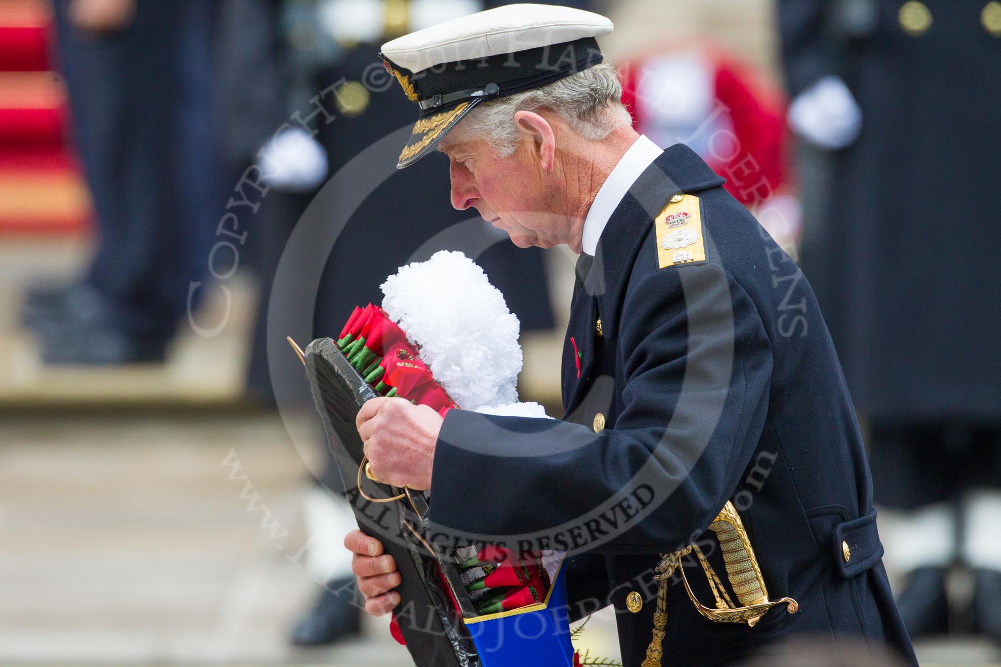 Remembrance Sunday at the Cenotaph in London 2014: HRH the Prince of Wales laying his wreath at the Cenotaph.