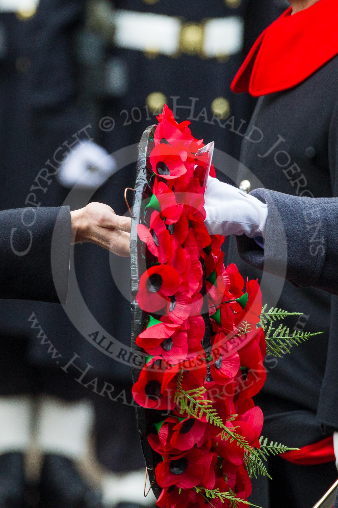 Remembrance Sunday at the Cenotaph in London 2014: Major Richard Morgan, equerry to HRH The Earl of Wessex, handing over the wreath.