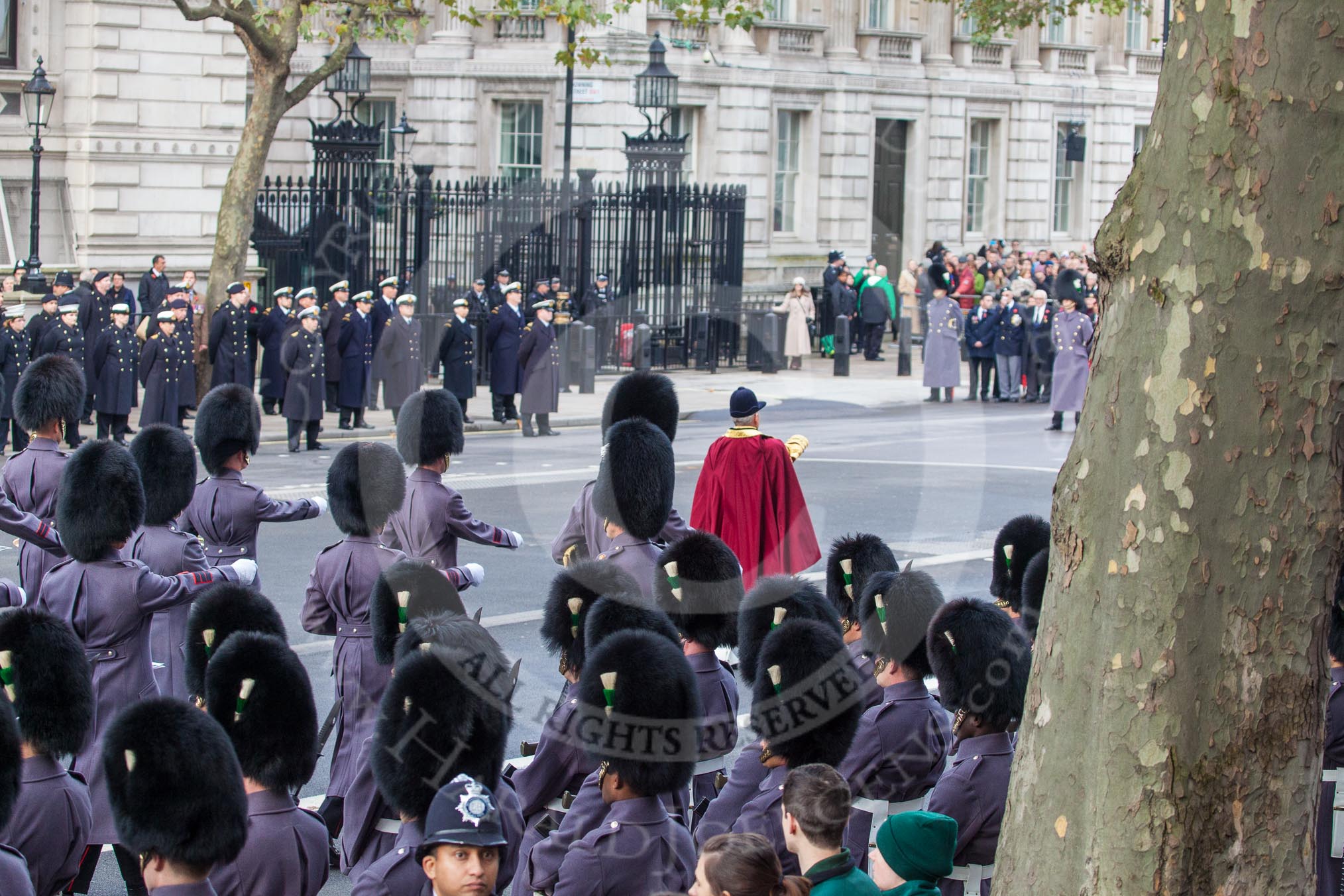 Remembrance Sunday at the Cenotaph in London 2014: The Band of the Coldstream Guards repositions to give way for the veterans for the March Past.