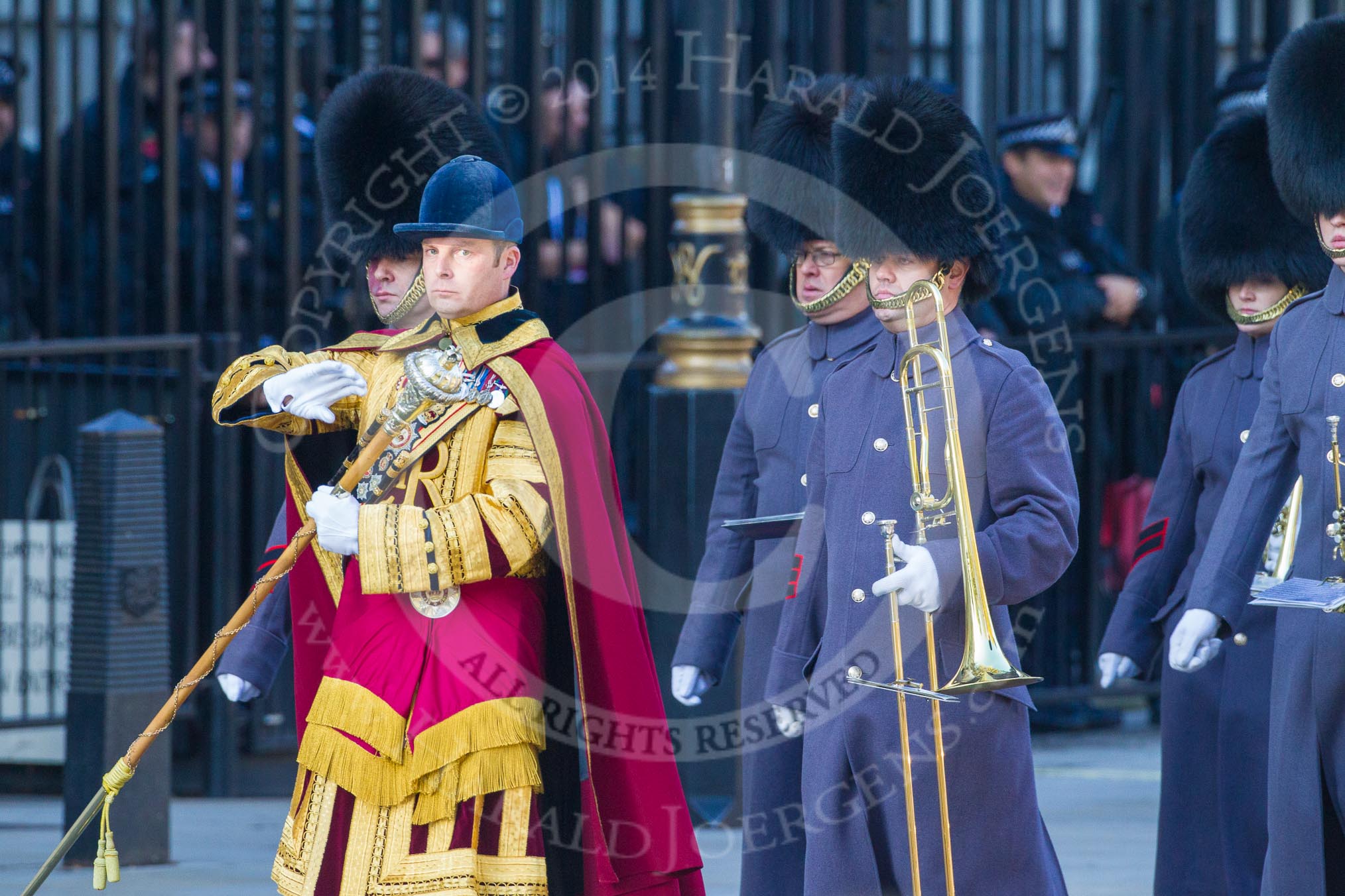 Remembrance Sunday at the Cenotaph in London 2014: Senior Drum Major Matthew Betts, Grenadier Guards, leading the band of the Scots Guards off Whithall after the event.