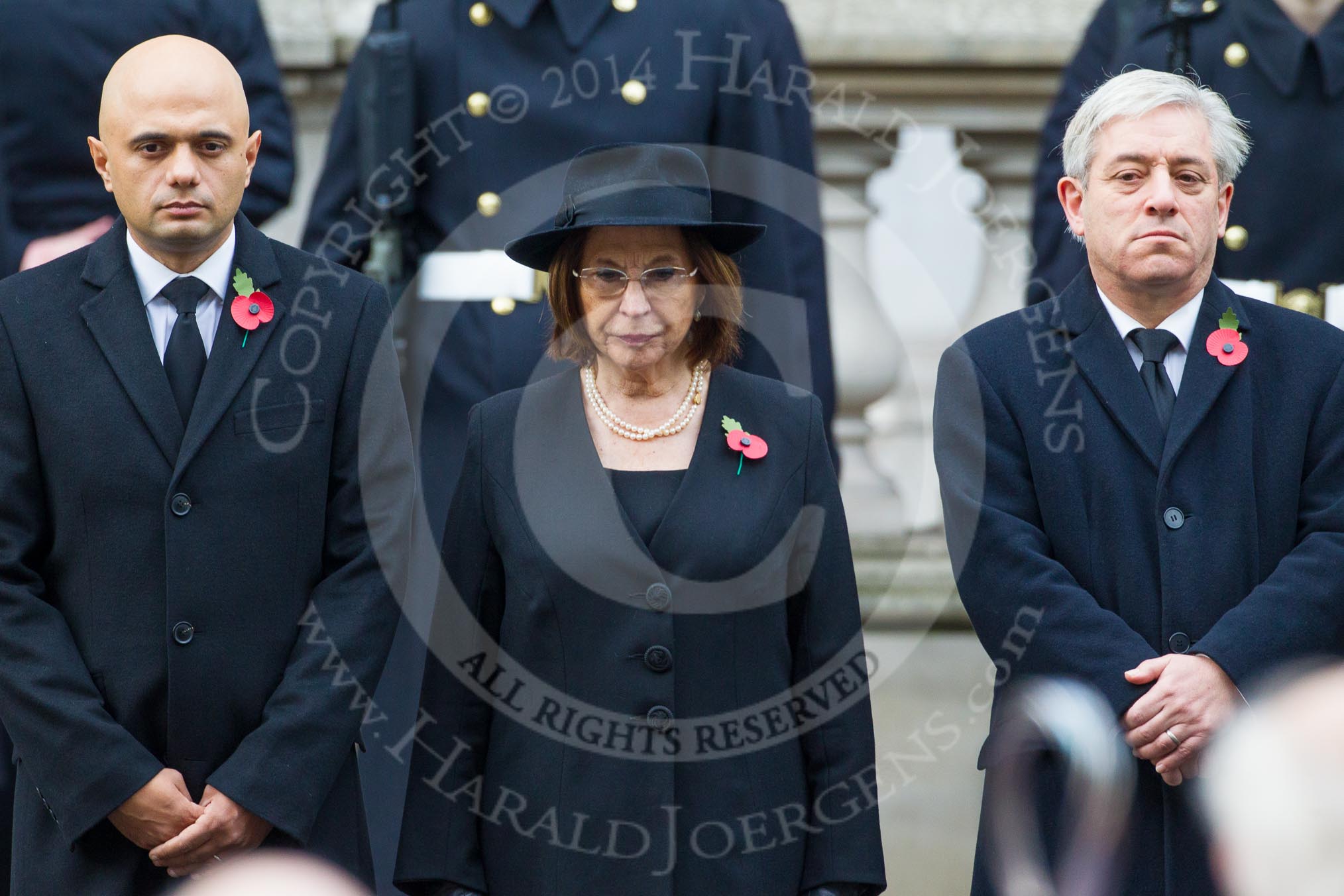 Remembrance Sunday at the Cenotaph in London 2014: Culture Secretary Sajid Javid, the Lord Speaker, Baroness D'Souza, and the Speaker of the House of Commons, John Berkow.