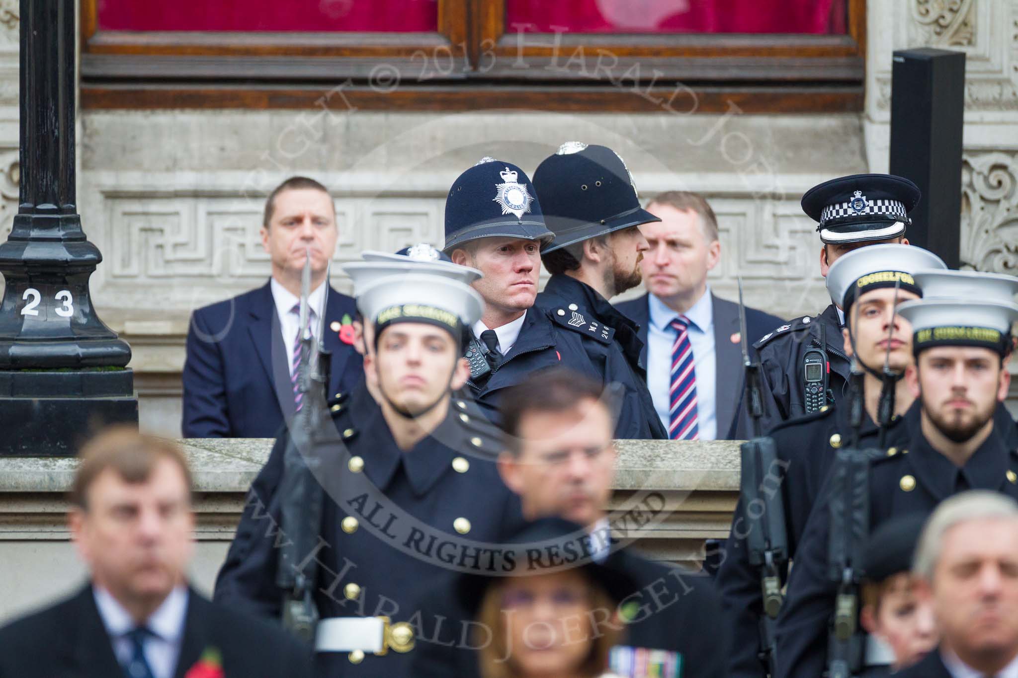 Remembrance Sunday at the Cenotaph 2015: Metropolitan Police watching the crowds. Image #304, 08 November 2015 11:18 Whitehall, London, UK