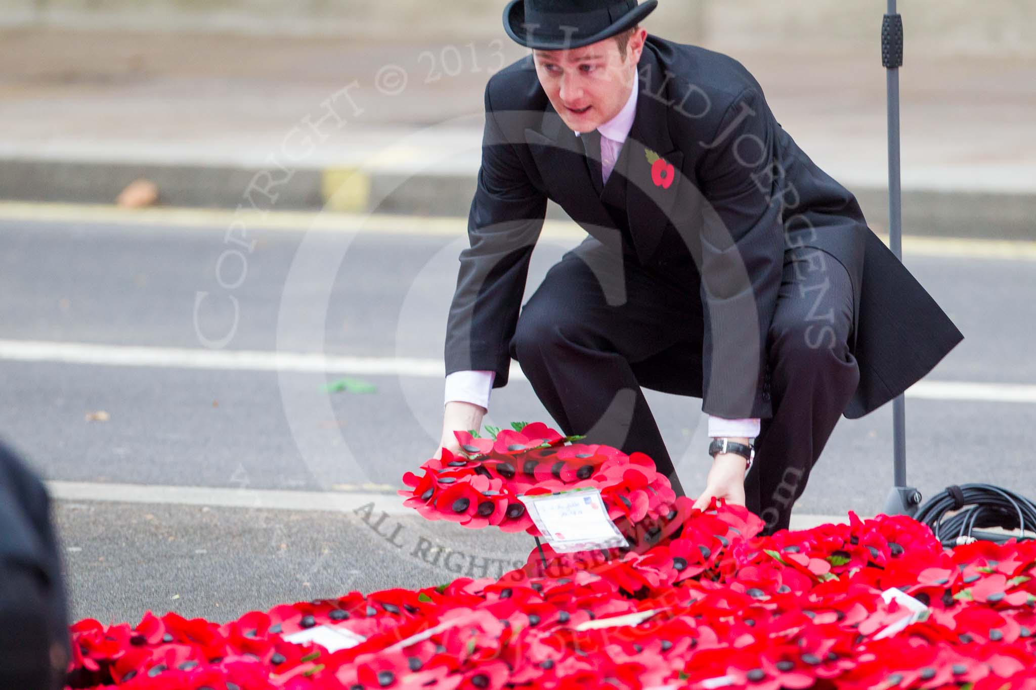 Remembrance Sunday at the Cenotaph 2015: The wreaths at the Cenotaph are re-arranged before the barriers go up and the public is allowed to get close. Image #373, 08 November 2015 12:39 Whitehall, London, UK
