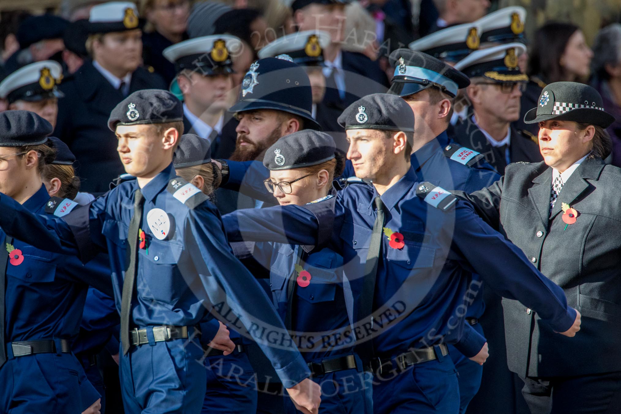 Metropolitan Police Volunteer Police Cadets (Group M42, 16 members) during the Royal British Legion March Past on Remembrance Sunday at the Cenotaph, Whitehall, Westminster, London, 11 November 2018, 12:31.