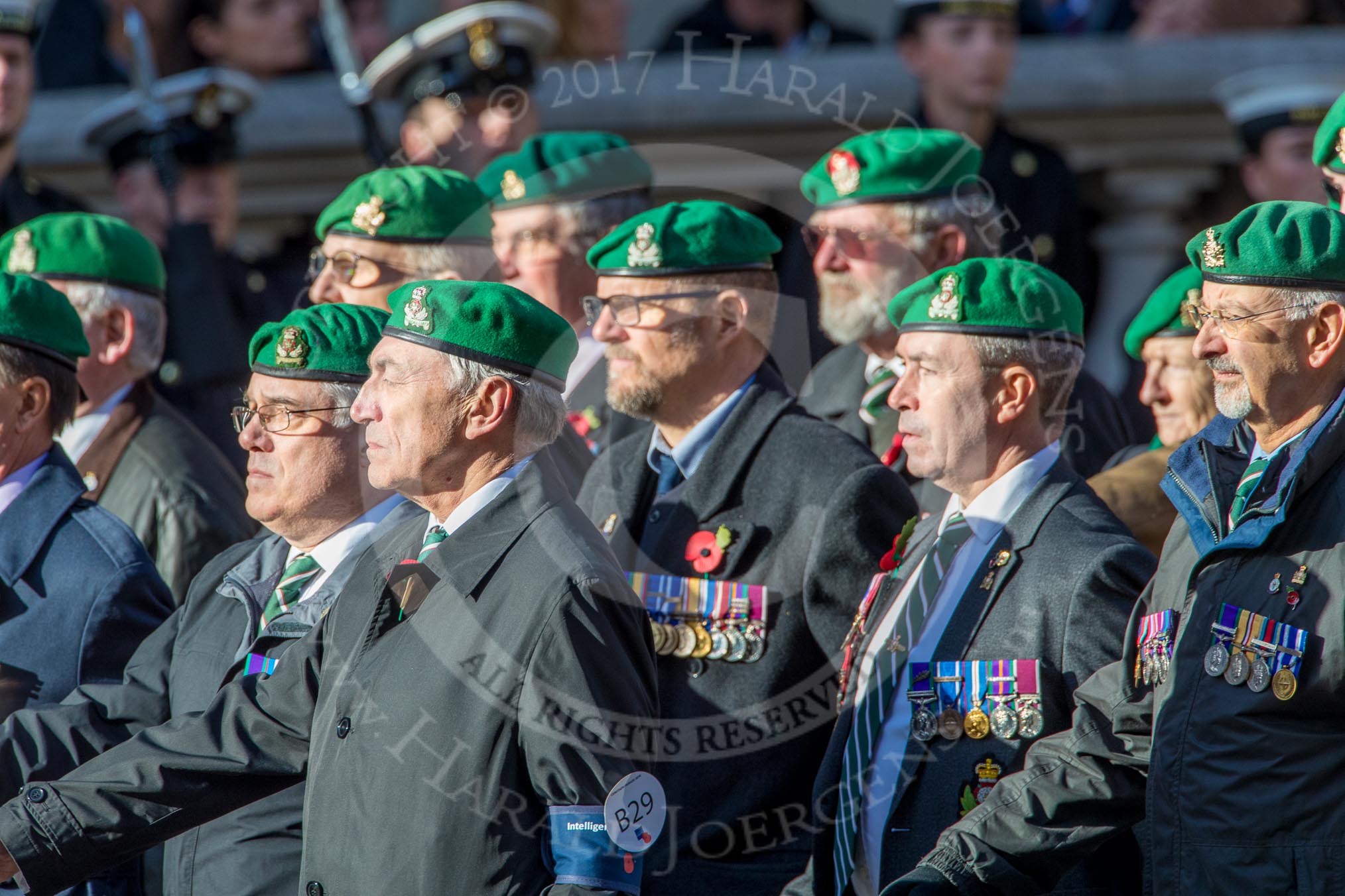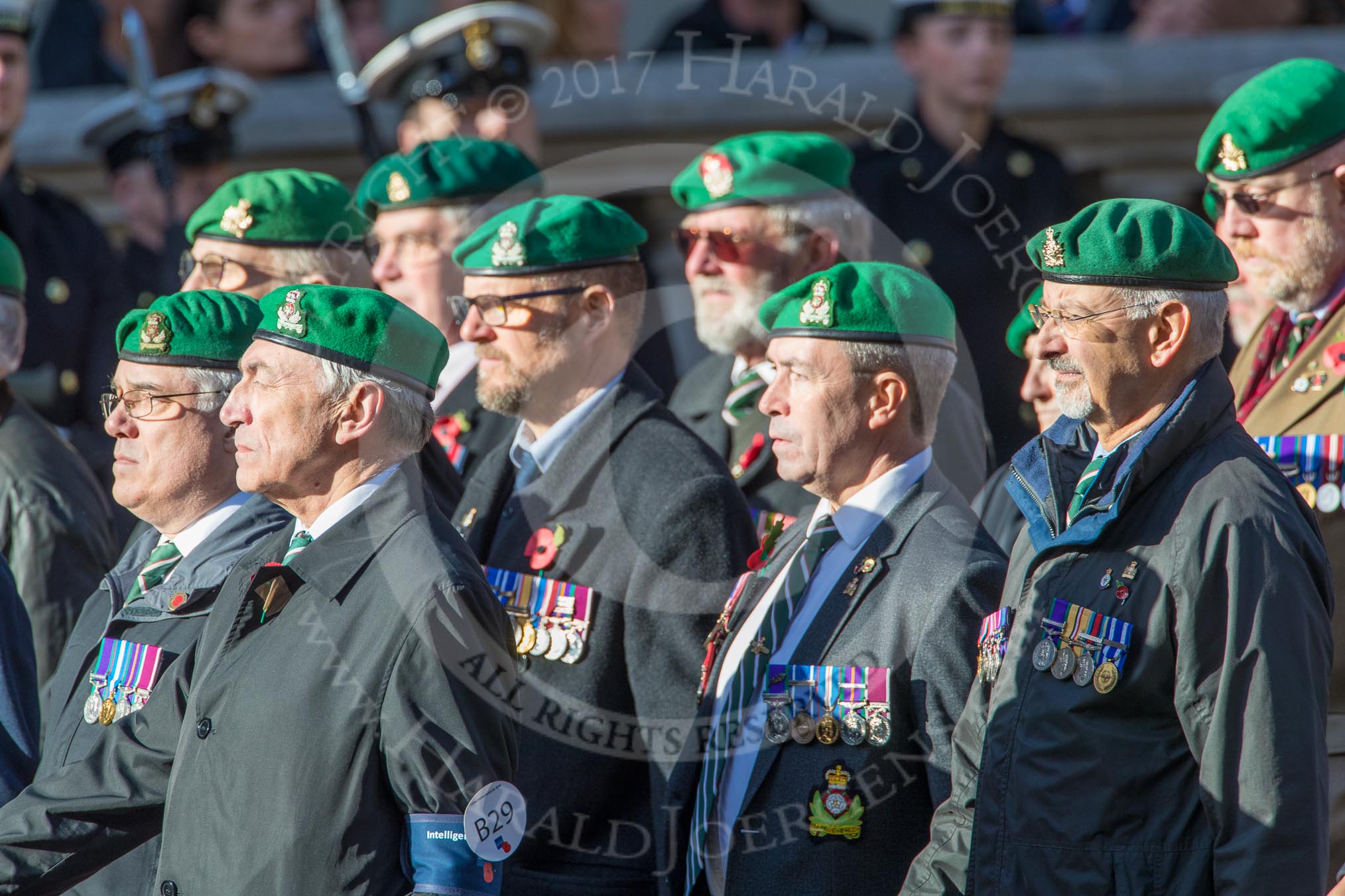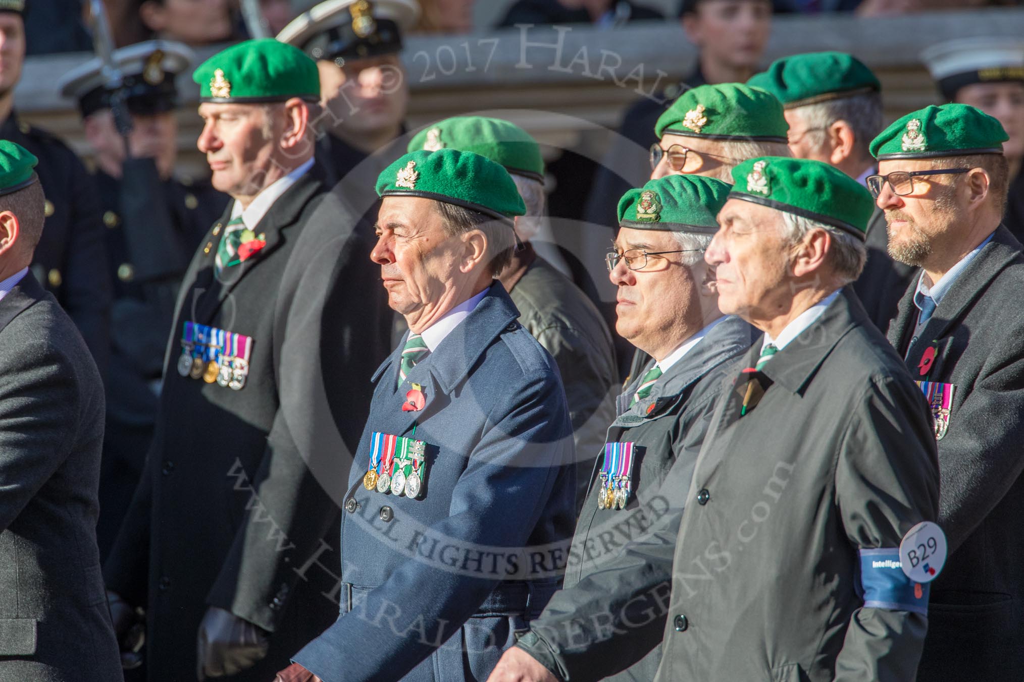 Intelligence Corps Association (Group B29, 35 members) during the Royal British Legion March Past on Remembrance Sunday at the Cenotaph, Whitehall, Westminster, London, 11 November 2018, 12:12.