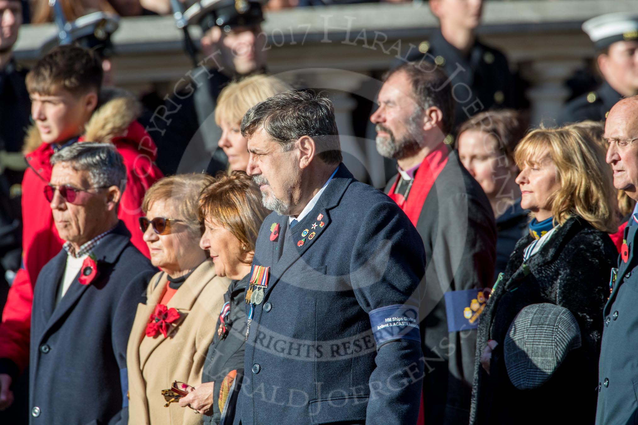 HMS Glorious, Ardent & Acasta Association (GLARAC) Association (Group E17, 27 members) during the Royal British Legion March Past on Remembrance Sunday at the Cenotaph, Whitehall, Westminster, London, 11 November 2018, 11:43.