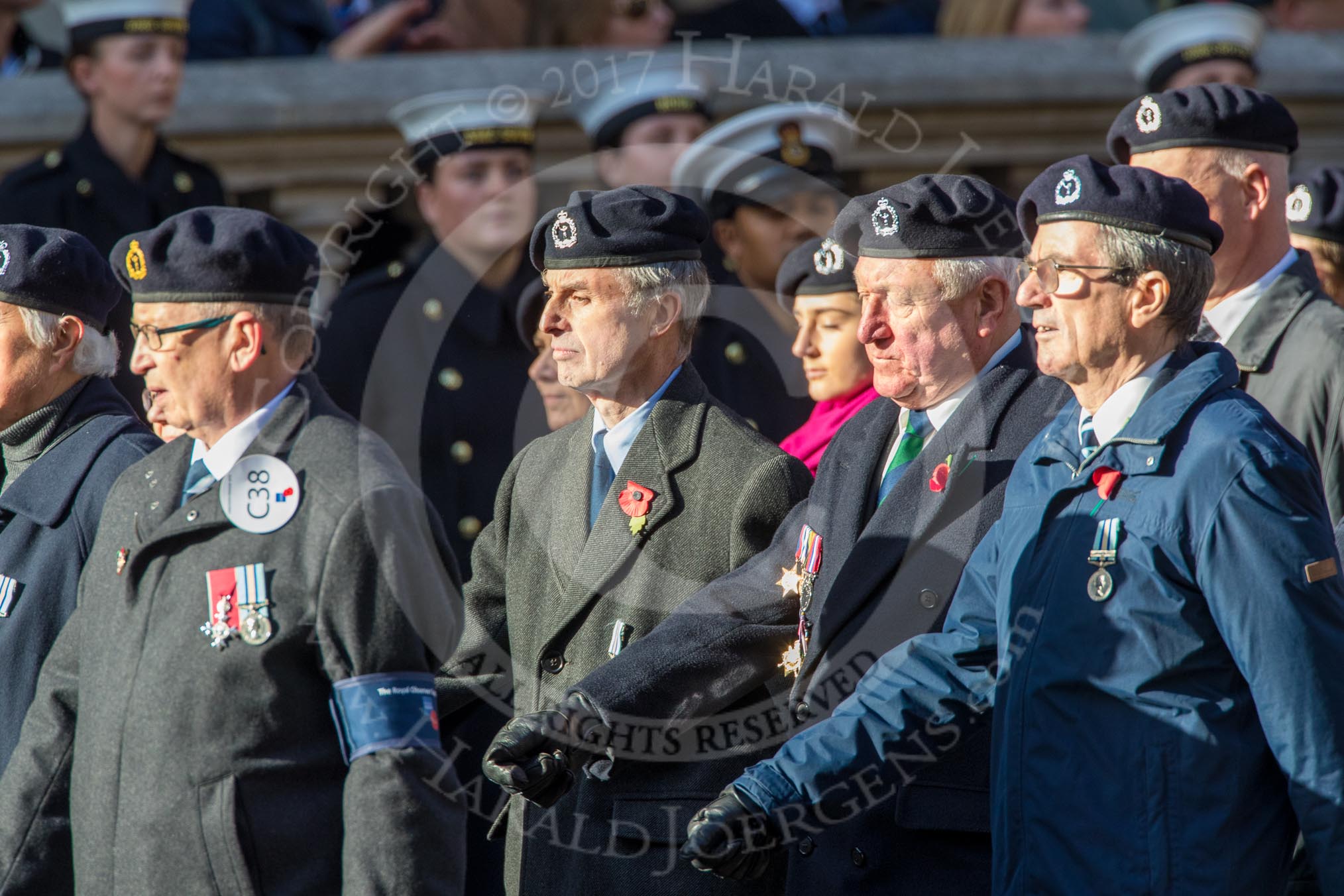Royal Observer Corps Association (Group C38, 67 members) during the Royal British Legion March Past on Remembrance Sunday at the Cenotaph, Whitehall, Westminster, London, 11 November 2018, 12:20.