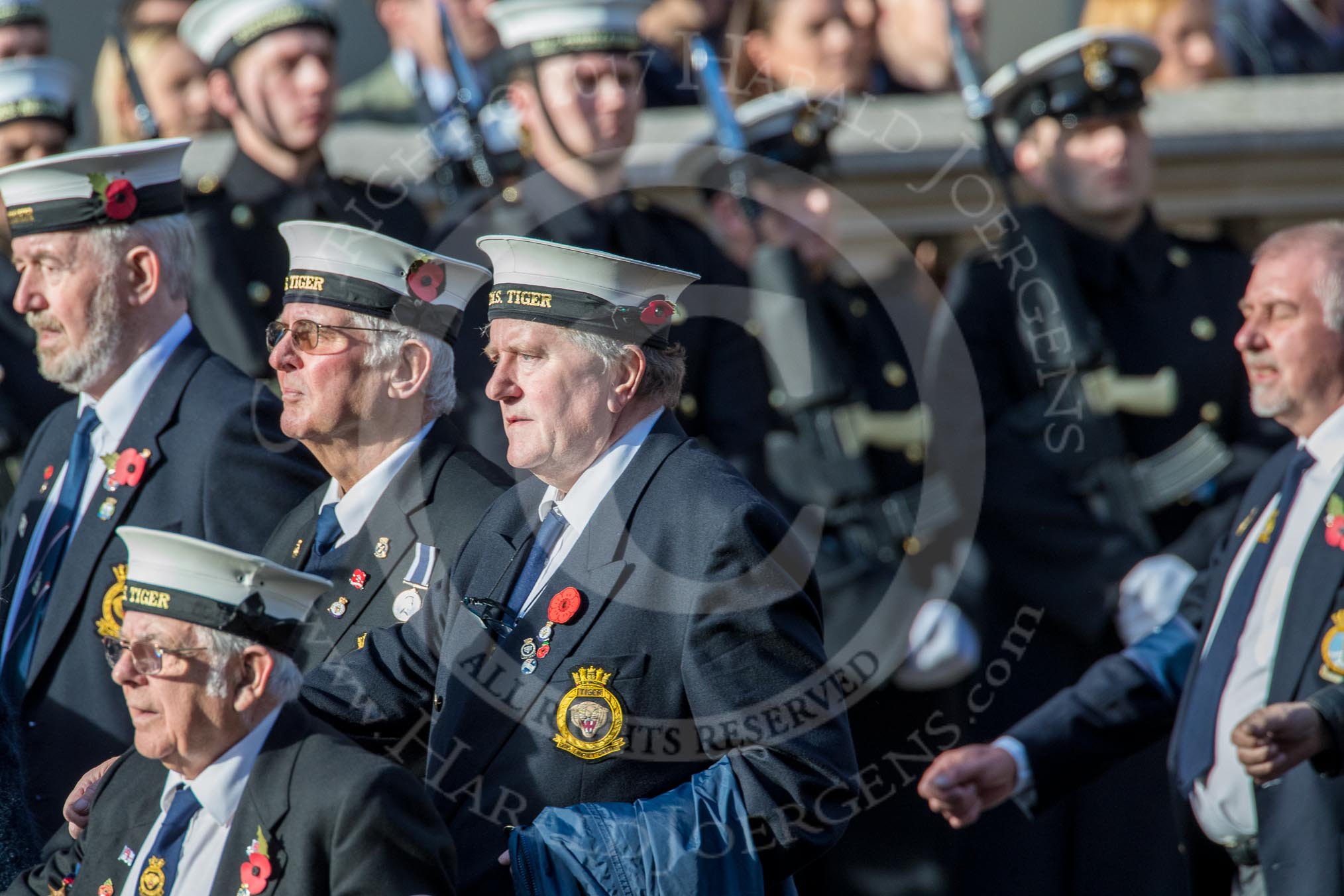 HMS Tiger Association (Group E25, 11 members) during the Royal British Legion March Past on Remembrance Sunday at the Cenotaph, Whitehall, Westminster, London, 11 November 2018, 11:44.