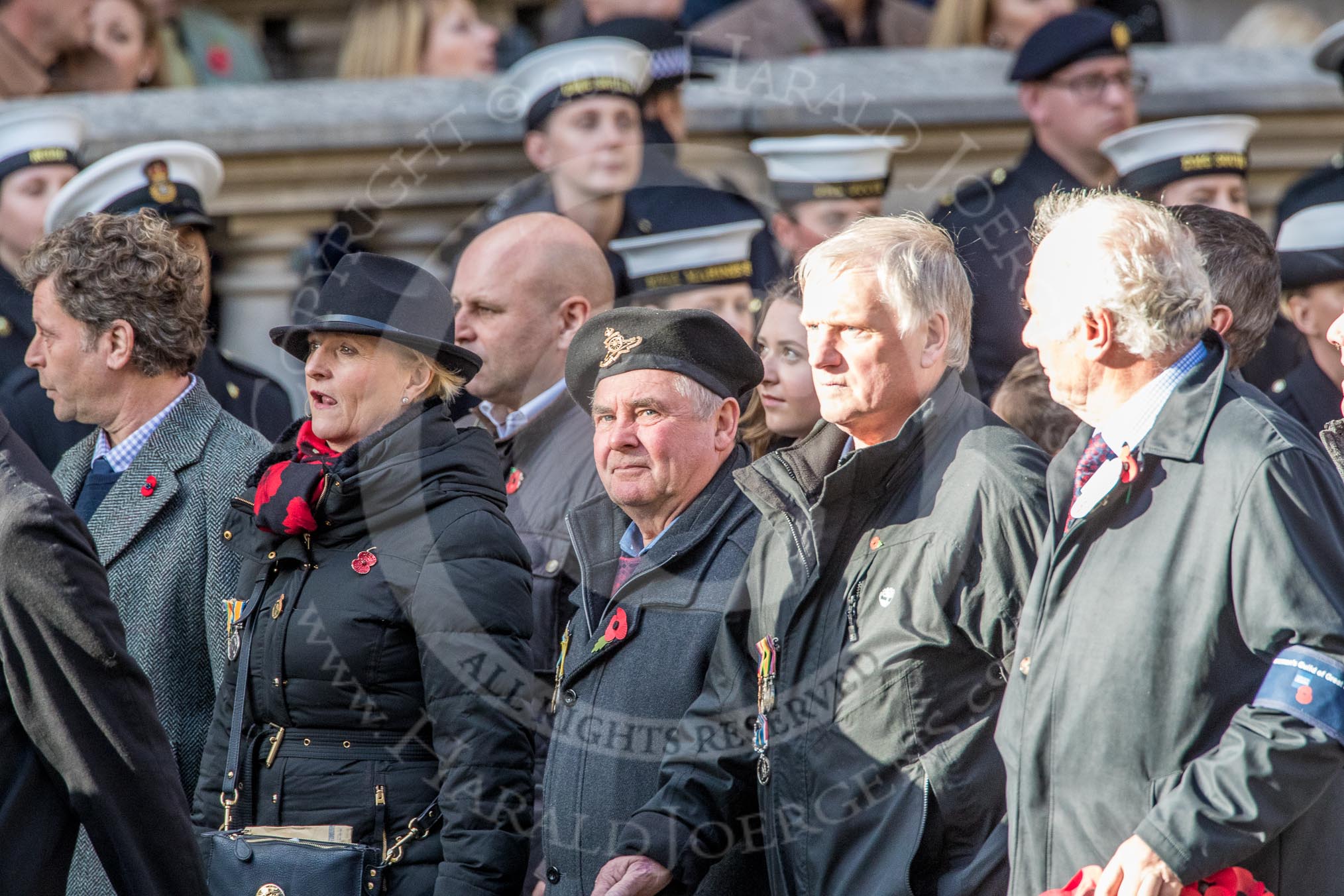 The Showmen's Guild of Great Britain (Group M18, 26 members) during the Royal British Legion March Past on Remembrance Sunday at the Cenotaph, Whitehall, Westminster, London, 11 November 2018, 12:27.