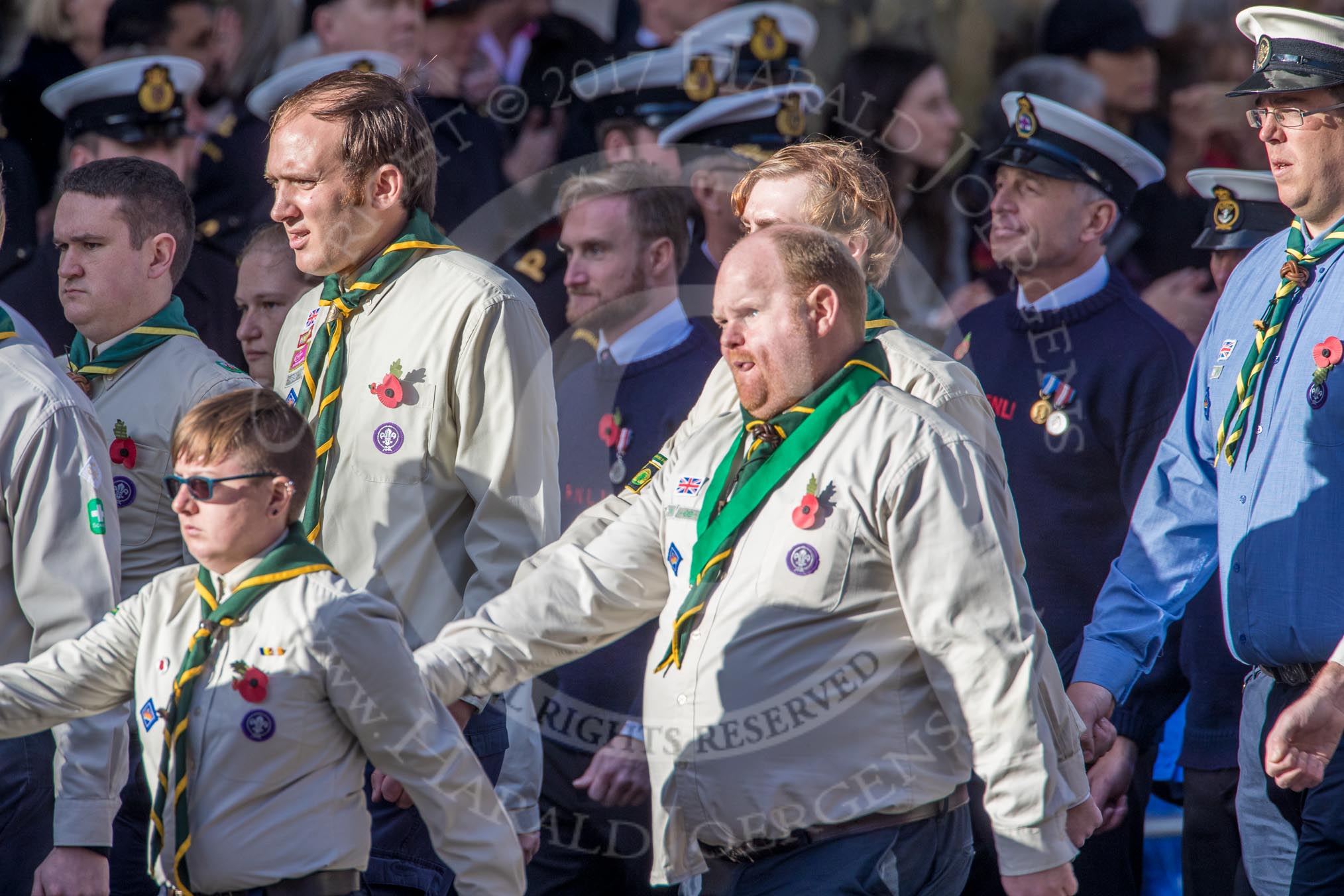 The Scout Association (Group M36, 30 members) during the Royal British Legion March Past on Remembrance Sunday at the Cenotaph, Whitehall, Westminster, London, 11 November 2018, 12:30.