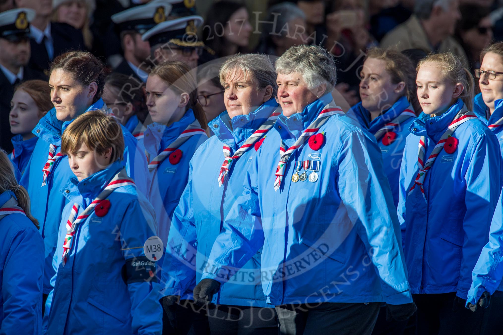 Girlguiding London and South East England(Group M38, 40 members) during the Royal British Legion March Past on Remembrance Sunday at the Cenotaph, Whitehall, Westminster, London, 11 November 2018, 12:30.