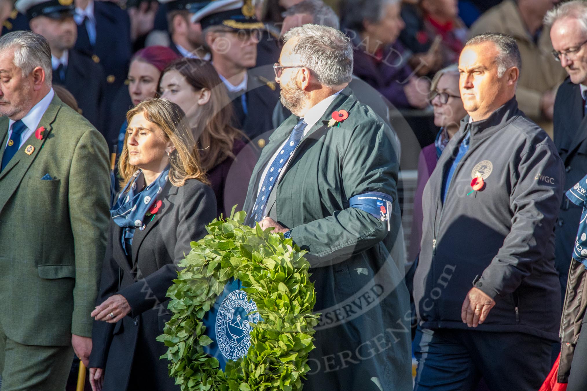 Commonwealth War Graves Commission (Group M50, 19 members) during the Royal British Legion March Past on Remembrance Sunday at the Cenotaph, Whitehall, Westminster, London, 11 November 2018, 12:31.
