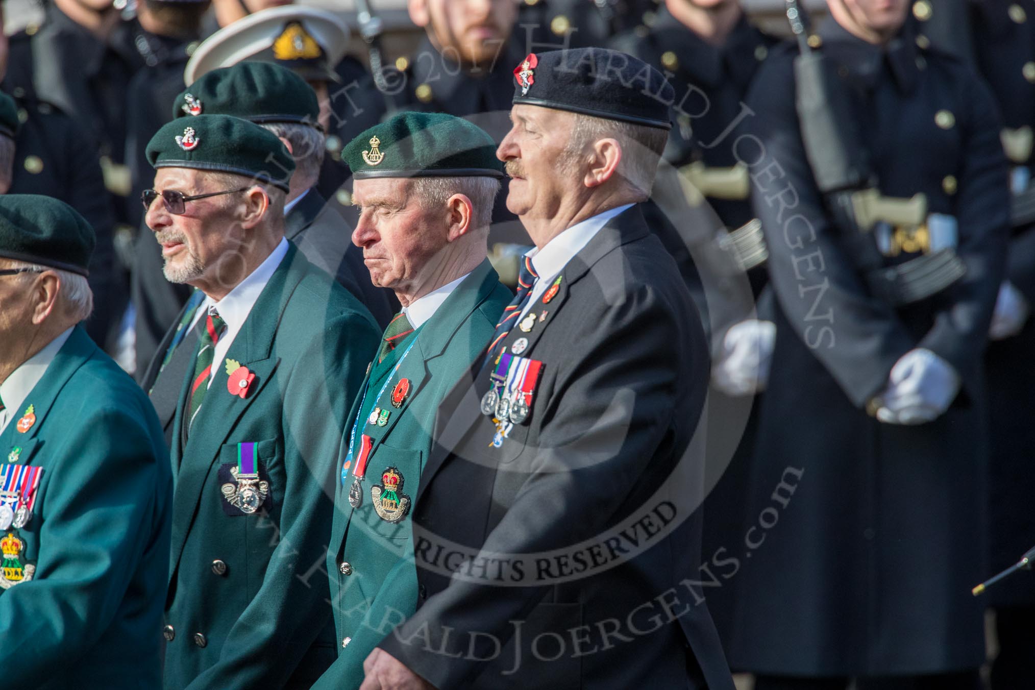 The Light Infantry Association (Group A4, 26 members) during the Royal British Legion March Past on Remembrance Sunday at the Cenotaph, Whitehall, Westminster, London, 11 November 2018, 11:56.