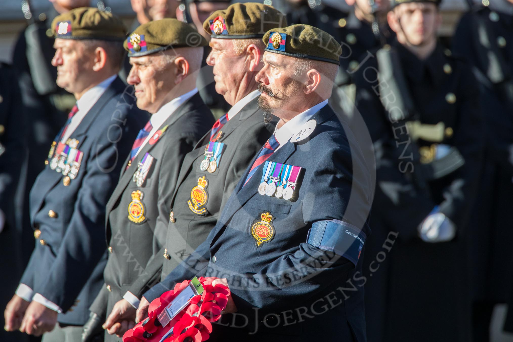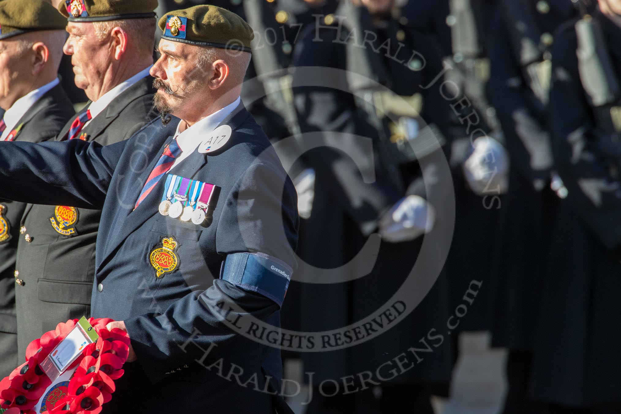 Grenadier Guards Association (Group A17, 4 members) during the Royal British Legion March Past on Remembrance Sunday at the Cenotaph, Whitehall, Westminster, London, 11 November 2018, 11:58.