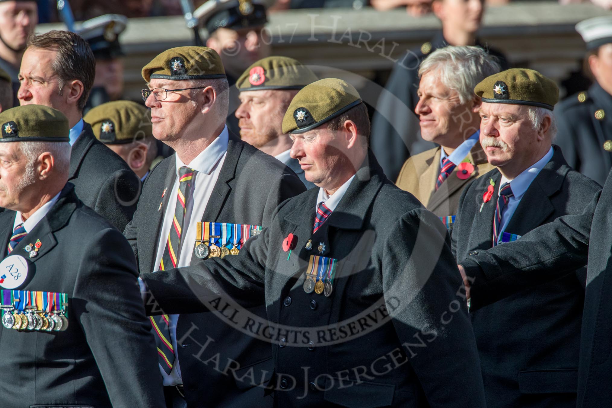The Royal Anglian Regiment (Group A28, 21 members) during the Royal British Legion March Past on Remembrance Sunday at the Cenotaph, Whitehall, Westminster, London, 11 November 2018, 12:01.