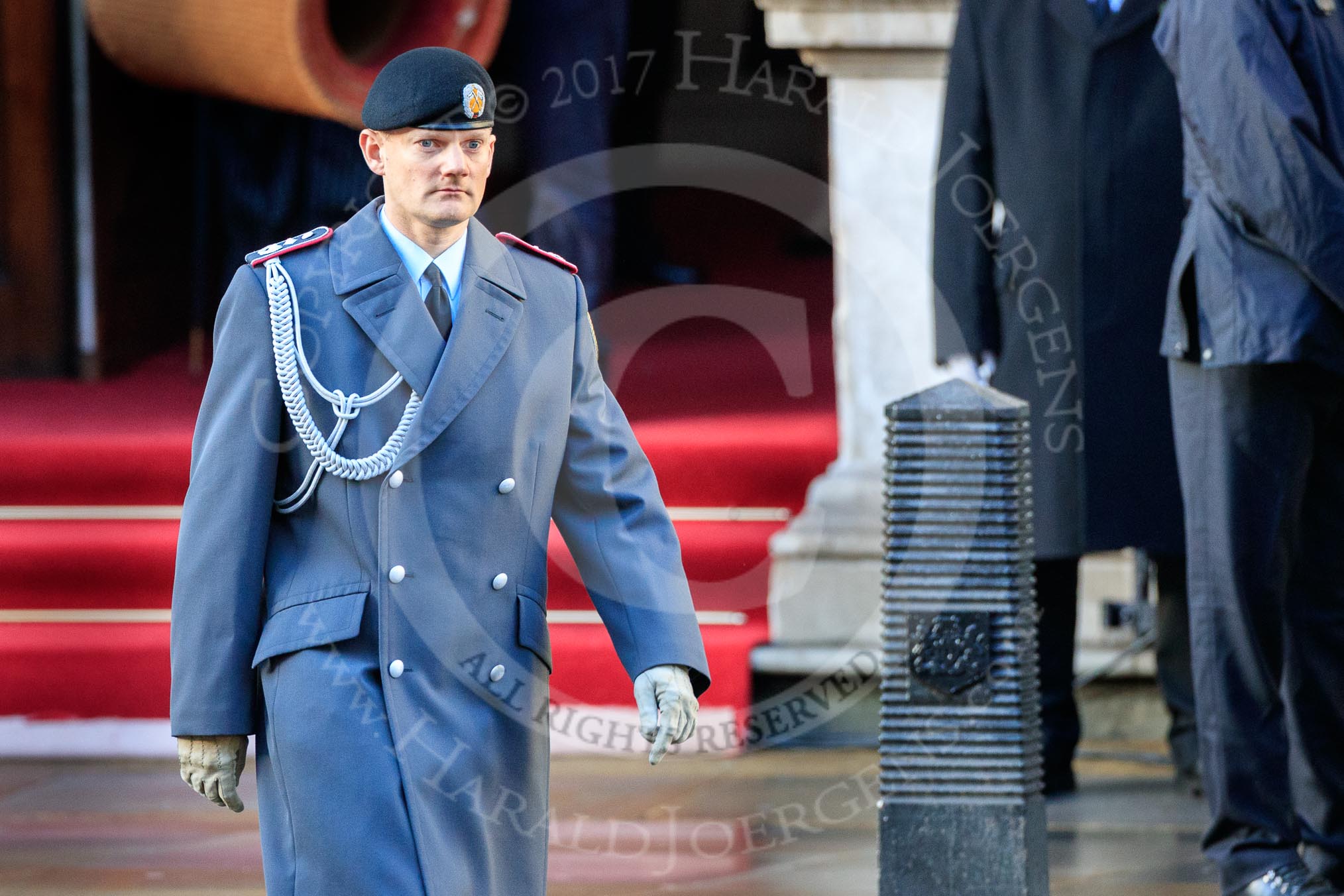 Lieutenant Colonel (German: Oberstleutnant) Christoph Kahnert, Equerry to HE The President of the Federal Republic of Germany, before the Remembrance Sunday Cenotaph Ceremony 2018 at Horse Guards Parade, Westminster, London, 11 November 2018, 09:42.