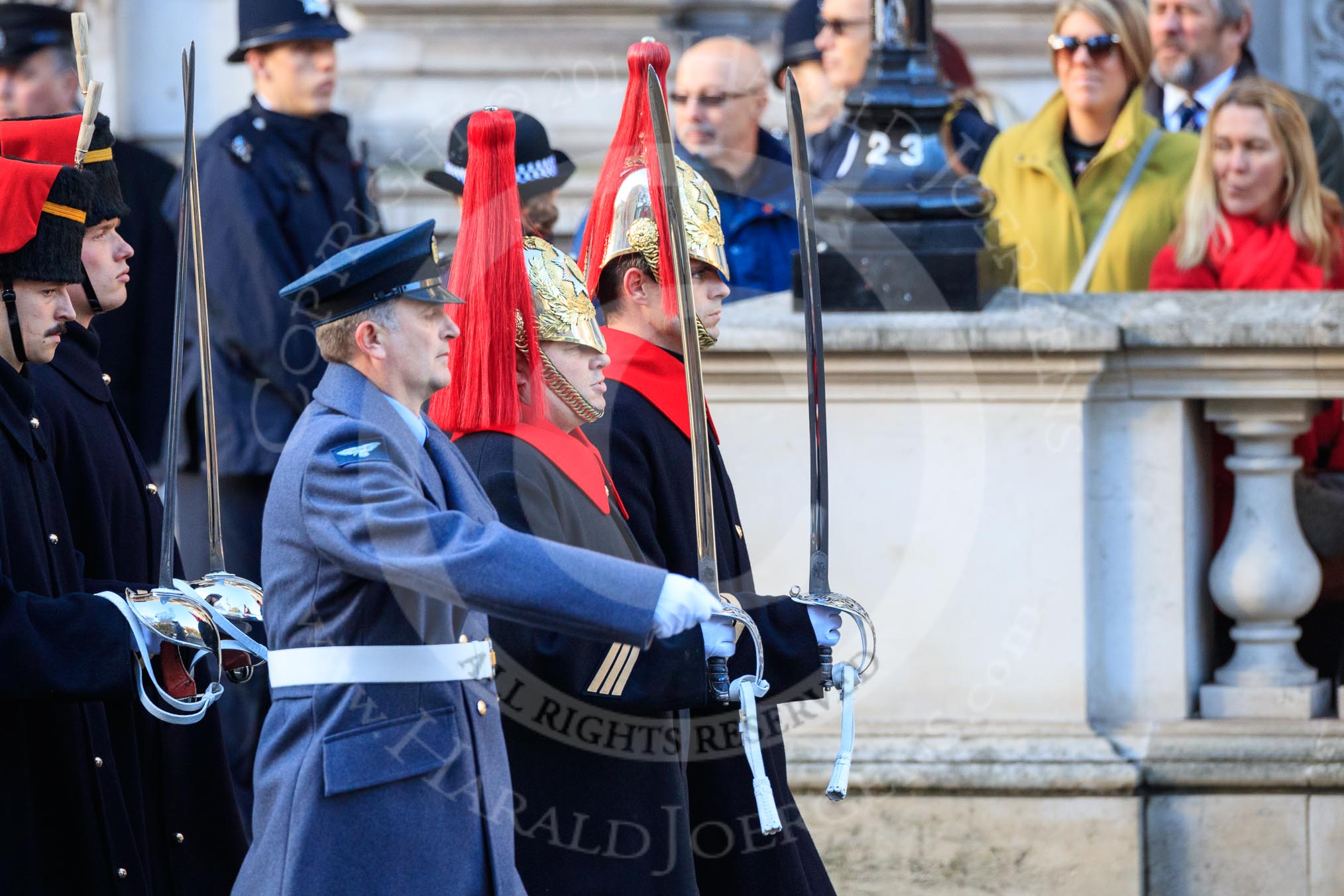 The first group of the Armed Forces arrives on Whitehall before the Remembrance Sunday Cenotaph Ceremony 2018 at Horse Guards Parade, Westminster, London, 11 November 2018, 09:48. They might be the "markers" for their service detachments, followed by stretcher bearers.