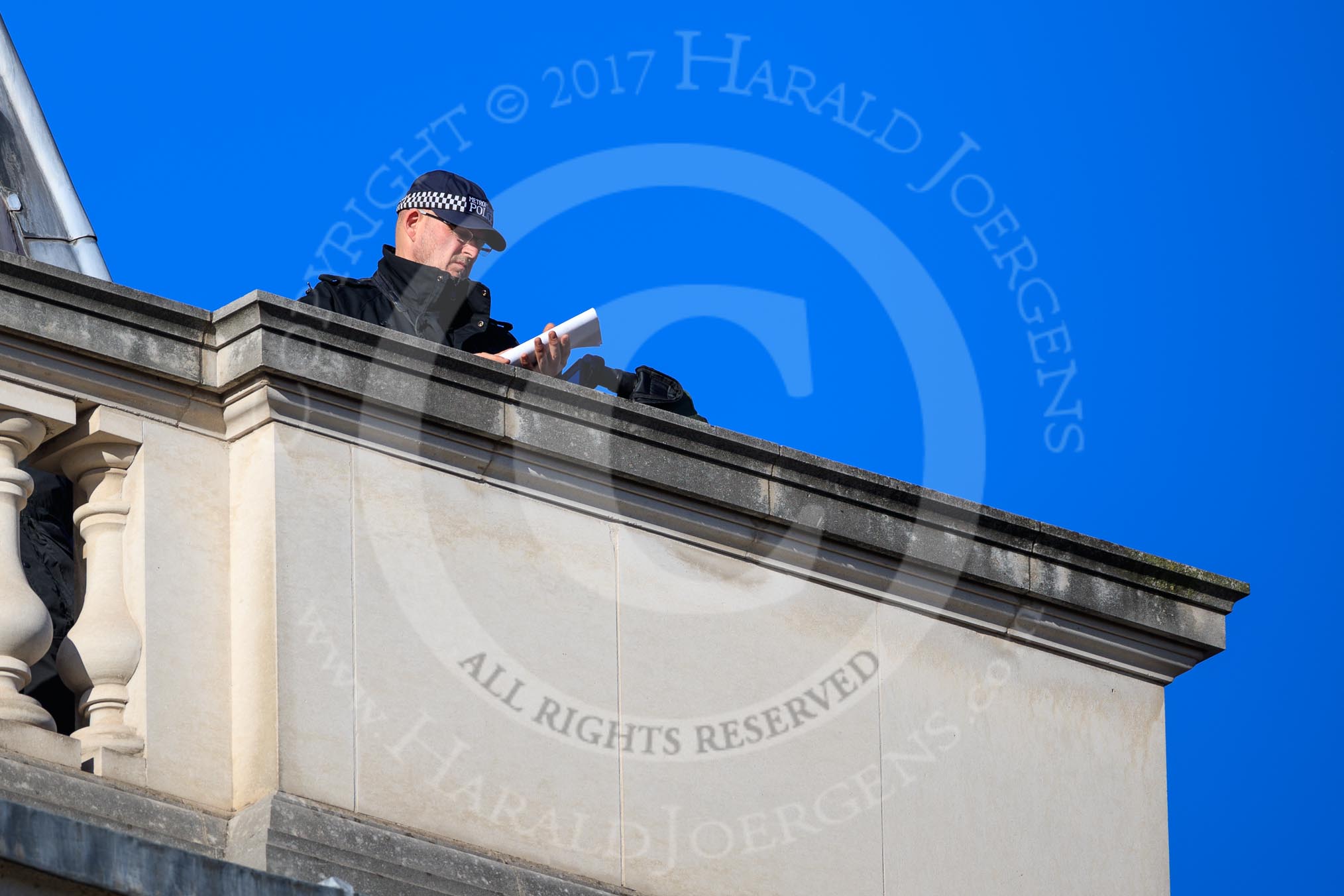 Photo #38 (1811110958111X29575HaraldJoergens) A police officer on the roof of the Foreign and Commonwealth Office before the Remembrance Sunday Cenotaph Ceremony 2018 at Horse Guards Parade, Westminster, London, 11 November 2018, 09:58.