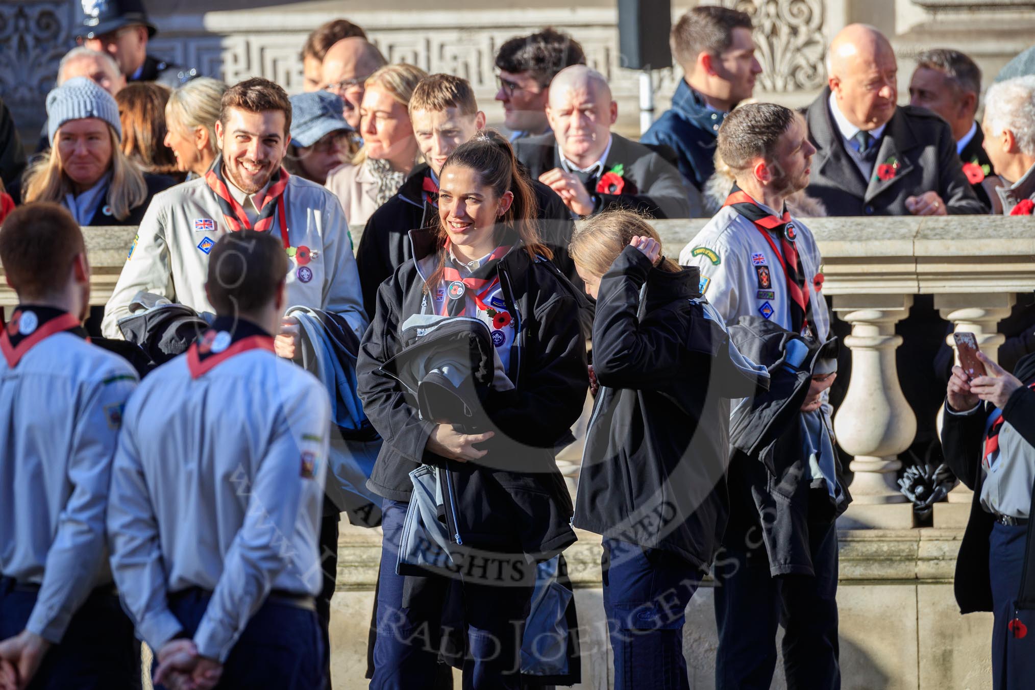 The The Queen's Scouts gathering before returning into the Foreign and Commonwealth Office before the Remembrance Sunday Cenotaph Ceremony 2018 at Horse Guards Parade, Westminster, London, 11 November 2018, 10:01.